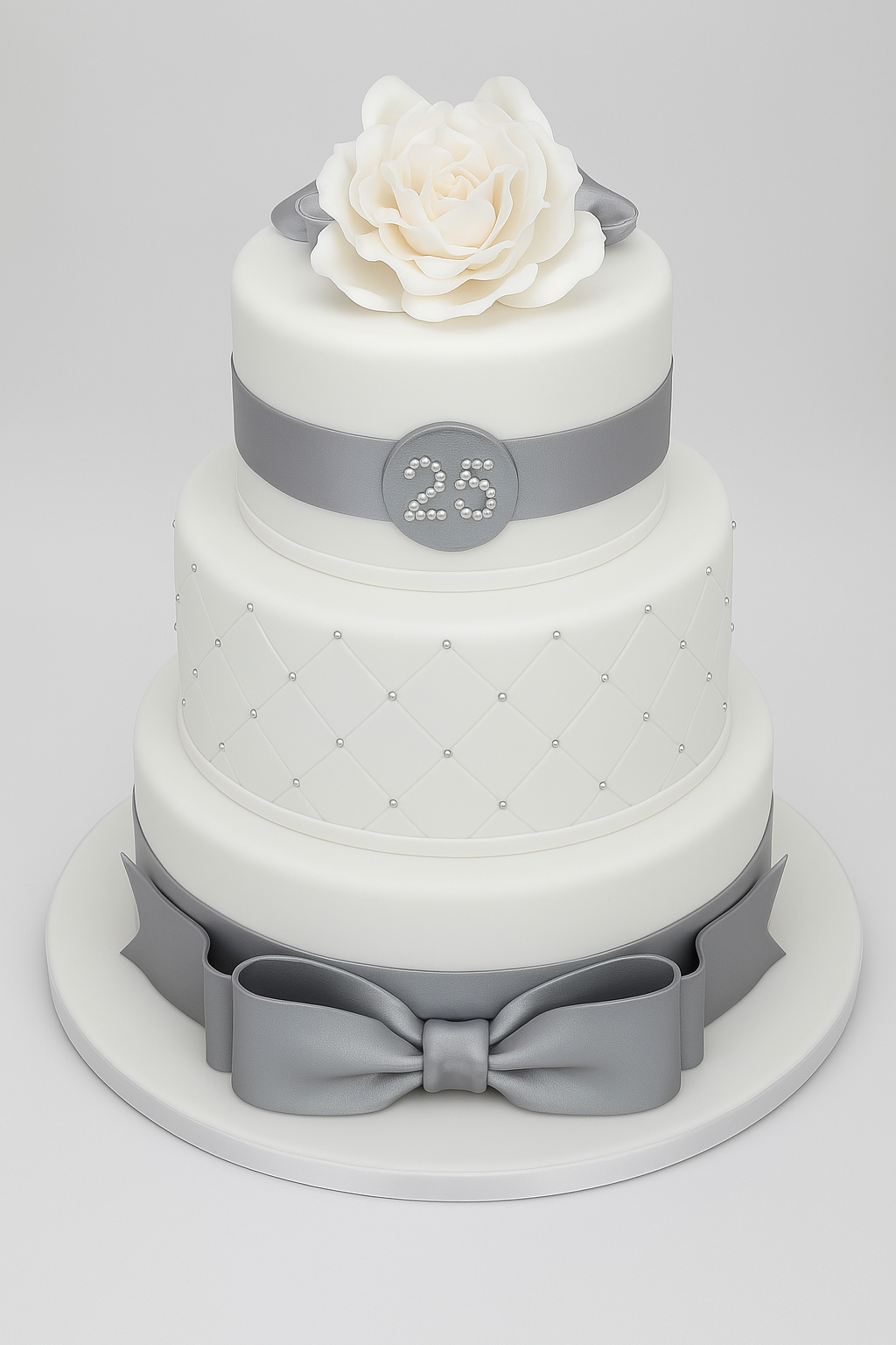 +44 7308 473219A stunning silver anniversary cake crafted to celebrate 25 magical years. Covered in smooth fondant with elegant silver ribbon detailing and starburst toppers.