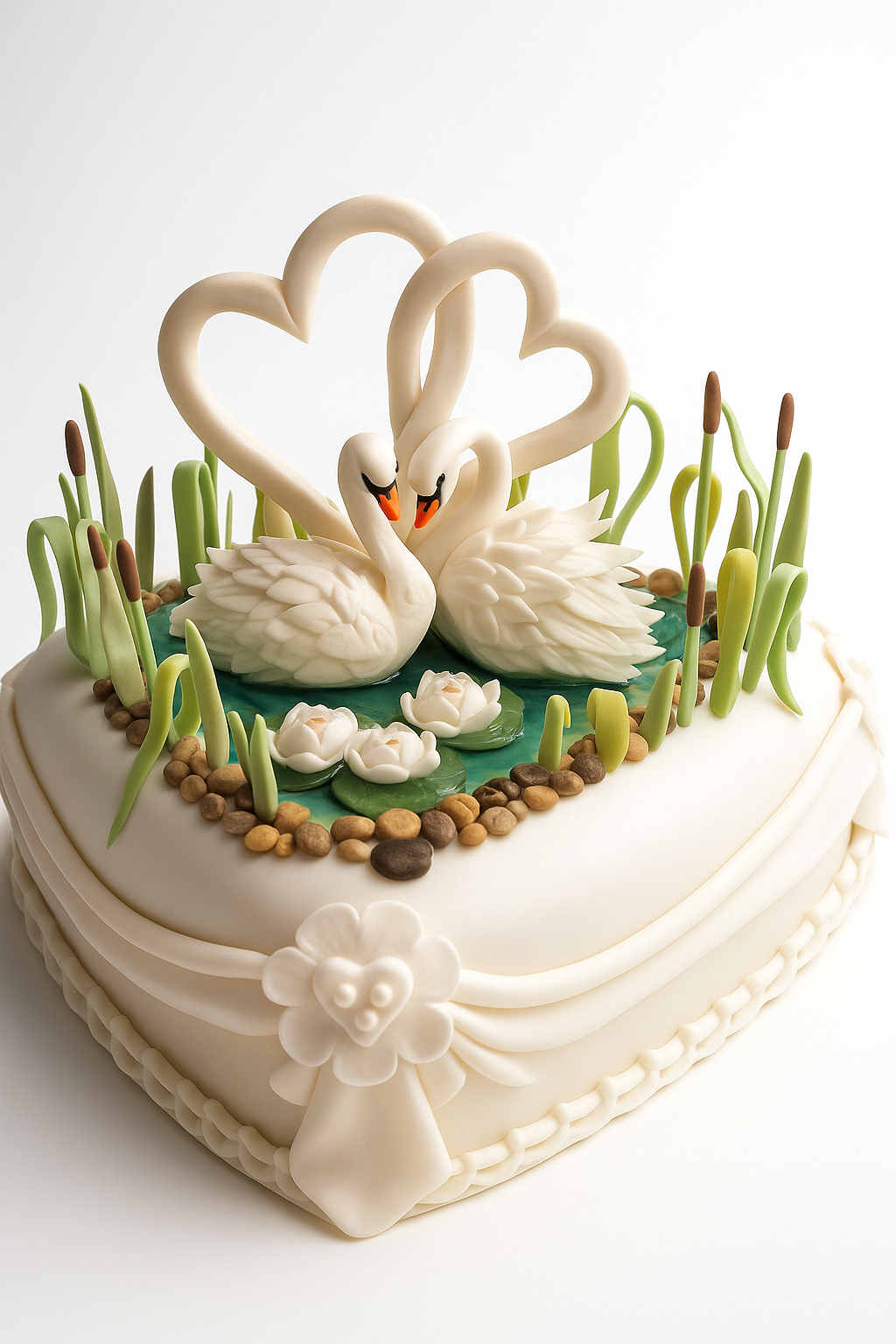 This elegant fondant cake features two swans forming a heart—perfect for weddings or romantic celebrations. Allergen Info: Contains allergens and may have traces of others due to cross-contamination. We do not accept allergy-specific orders. Not suitable for allergy sufferers. Please speak to staff for full details. Note: Larger cakes may have extra tiers. Design and colour may vary moderately from images.
