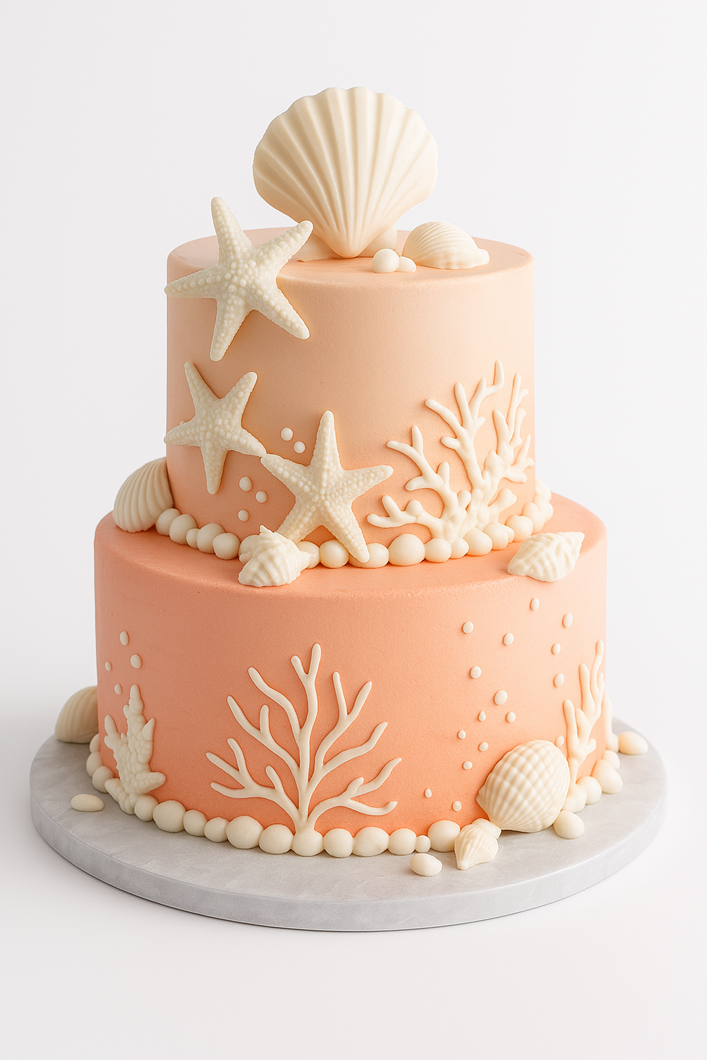 This fondant cake features an elegant under-the-sea theme with coral, starfish, and seashell accents in soft peach and ivory tones. Perfect for birthday Celebration. Allergen Info: Contains allergens and may have traces of others due to cross-contamination. We do not accept allergy-specific orders. Not suitable for allergy sufferers. Please speak to staff for full details. Note: Larger cakes may have extra tiers. Design and colour may vary moderately from images.