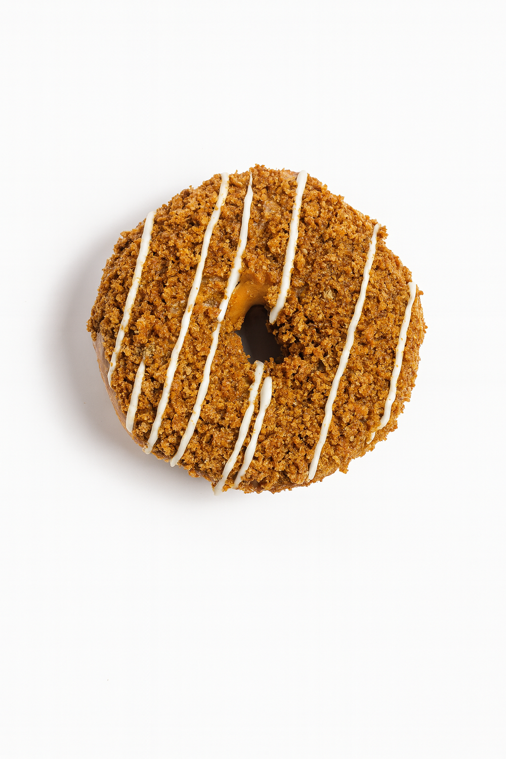 A soft vegan donut coated with smooth caramel glaze, generously topped with crunchy Biscoff crumble and finished with a drizzle of white icing.