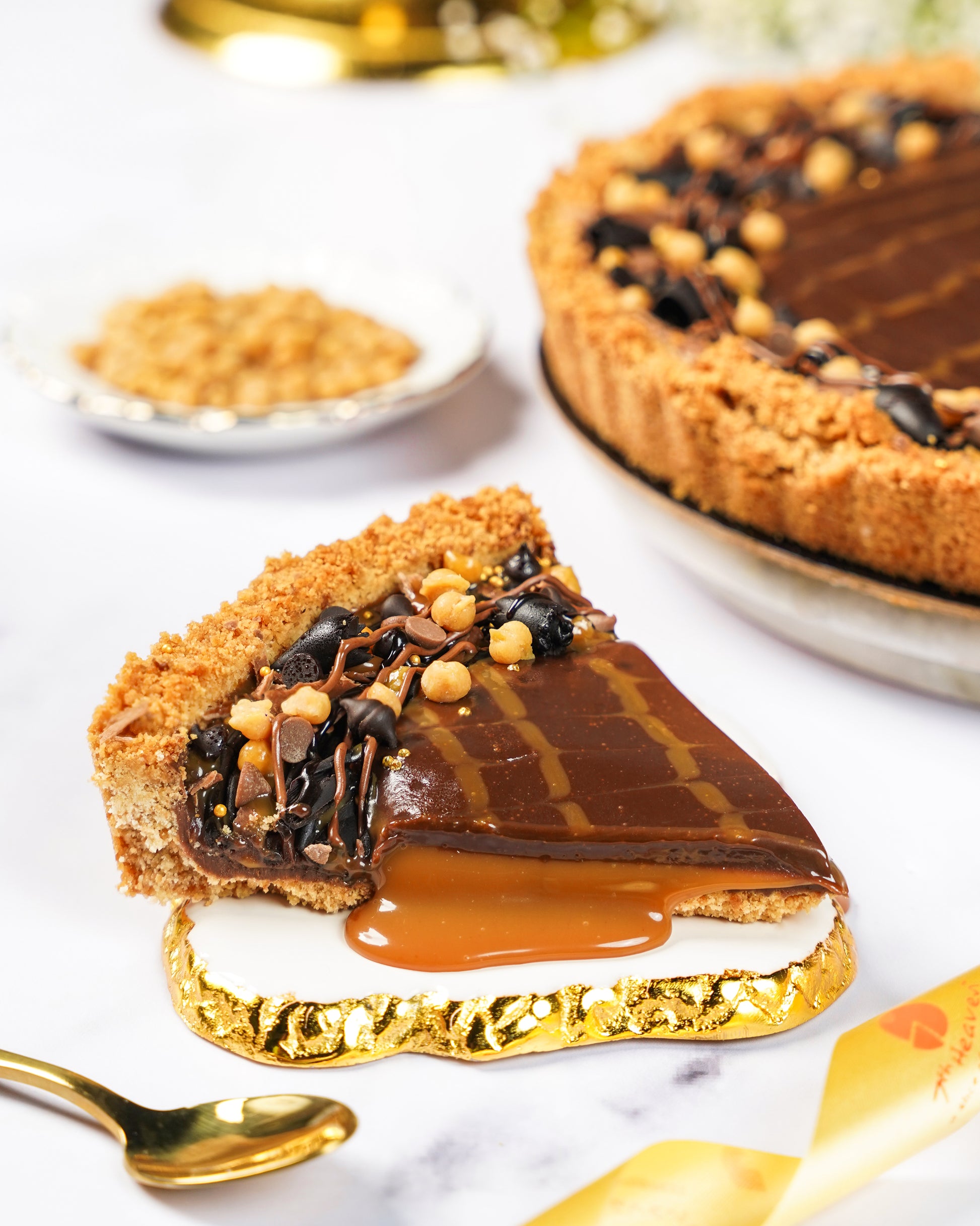 +44 7308 473219A crunchy tart cake filled with luscious caramel, chocolate ganache, golden pearls and dark chocolate swirls is perfect for festive occasions. Size is 8"