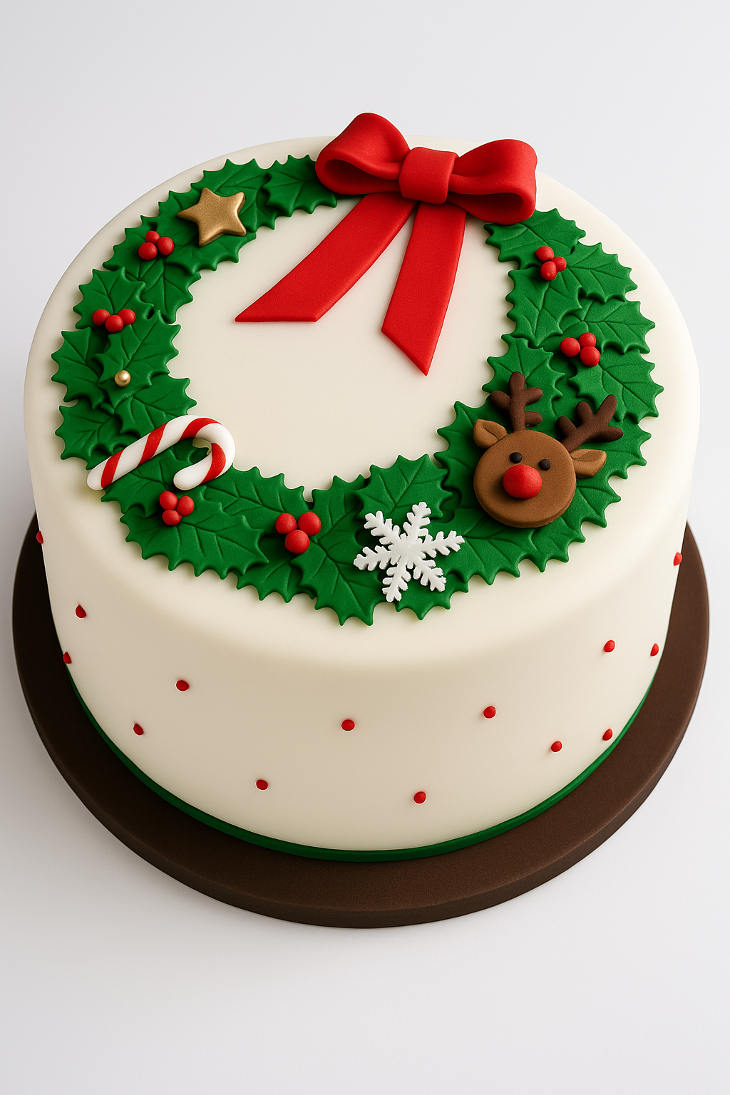 A festive fondant cake featuring a vibrant Christmas wreath with holly leaves, candy cane, snowflake, reindeer, and a bold red bow—perfect for holiday cheer! Allergen Info: Contains allergens and may have traces of others due to cross-contamination. We do not accept allergy-specific orders. Not suitable for allergy sufferers. Please speak to staff for full details. Note: Larger cakes may have extra tiers. Design and colour may vary moderately from images.