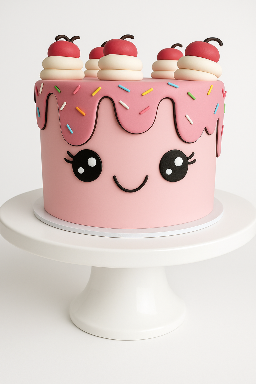 A fondant-covered cake with a cute animated face, pink drip detailing, colourful sprinkles, and cherry toppers is perfect for kids' birthdays or baby showers. Allergen Info: Contains allergens and may have traces of others due to cross-contamination. We do not accept allergy-specific orders. Not suitable for allergy sufferers. Please speak to staff for full details. Note: Larger cakes may have extra tiers. Design and colour may vary moderately from images.