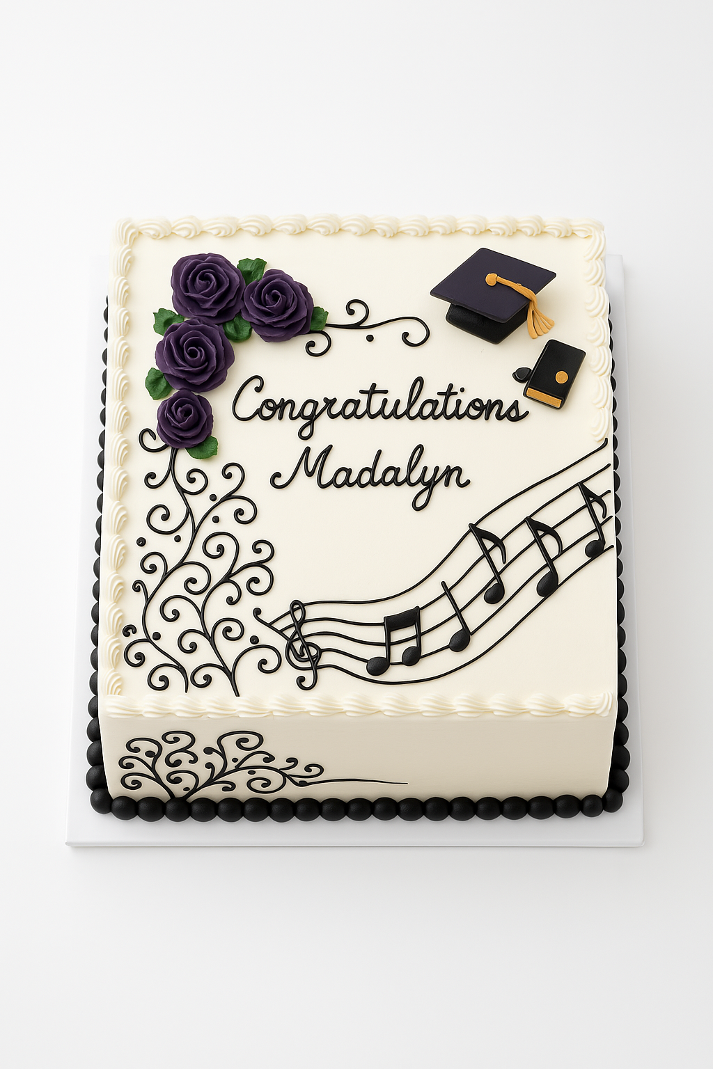 A striking cake designed to celebrate academic success with a musical twist; perfect for graduates with a love for music. Decorated with smooth cream frosting and edible fondant accents, including graduation caps and music notes.