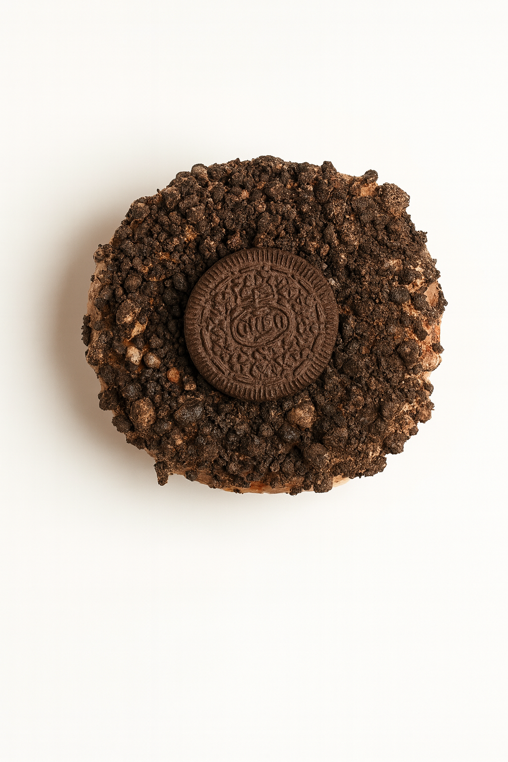 A fluffy vegan donut dipped in creamy glaze, loaded with crushed Oreos, and topped with a whole Oreo cookie for the ultimate cookies & cream indulgence.