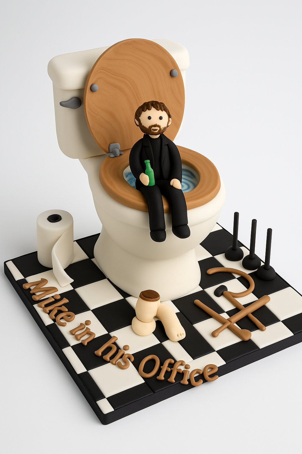+44 7308 473219A hilarious novelty cake perfect for office parties, roasts, or adult birthday celebrations. Decorated with fondant details including a toilet seat, checkered tiles, accessories, and a funny character figure in a humorous office theme.