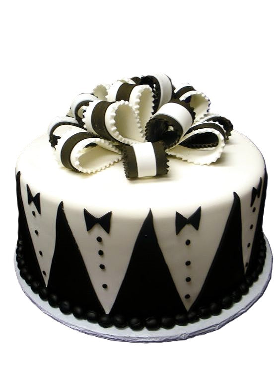 A dapper fondant cake designed like a tuxedo, topped with an elegant black-and-white fondant bow. Allergen Info: Contains allergens and may have traces of others due to cross-contamination. We do not accept allergy-specific orders. Not suitable for allergy sufferers. Please speak to staff for full details.. Note: Larger cakes may have extra tiers. Design and colour may vary moderately from images.