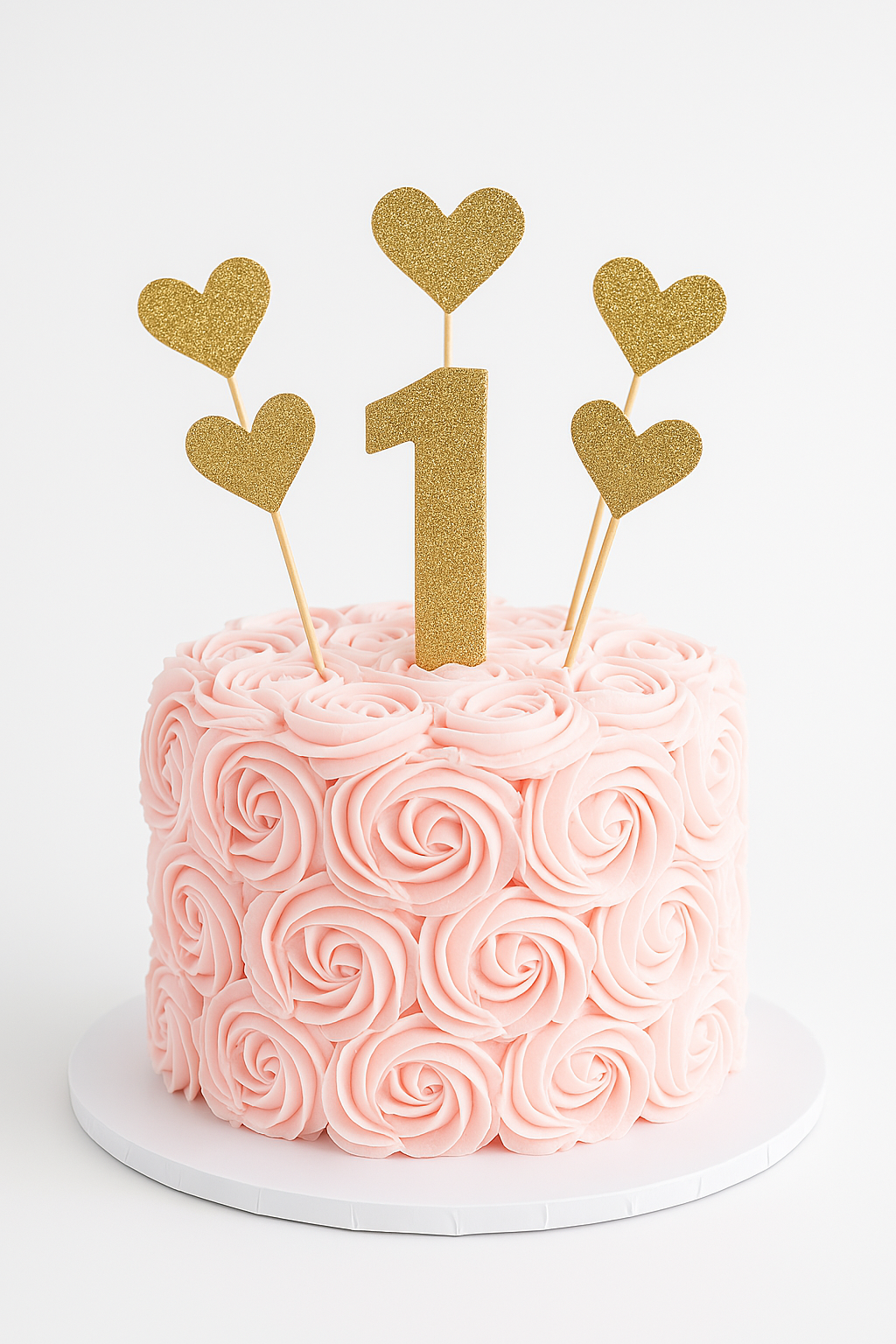 A charming buttercream cake adorned with delicate pink rosettes — perfect for a first birthday celebration. Allergen Info: Contains allergens and may have traces of others due to cross-contamination. We do not accept allergy-specific orders. Not suitable for allergy sufferers. Please speak to staff for full details. Note: Larger cakes may have extra tiers. Design and colour may vary moderately from images.