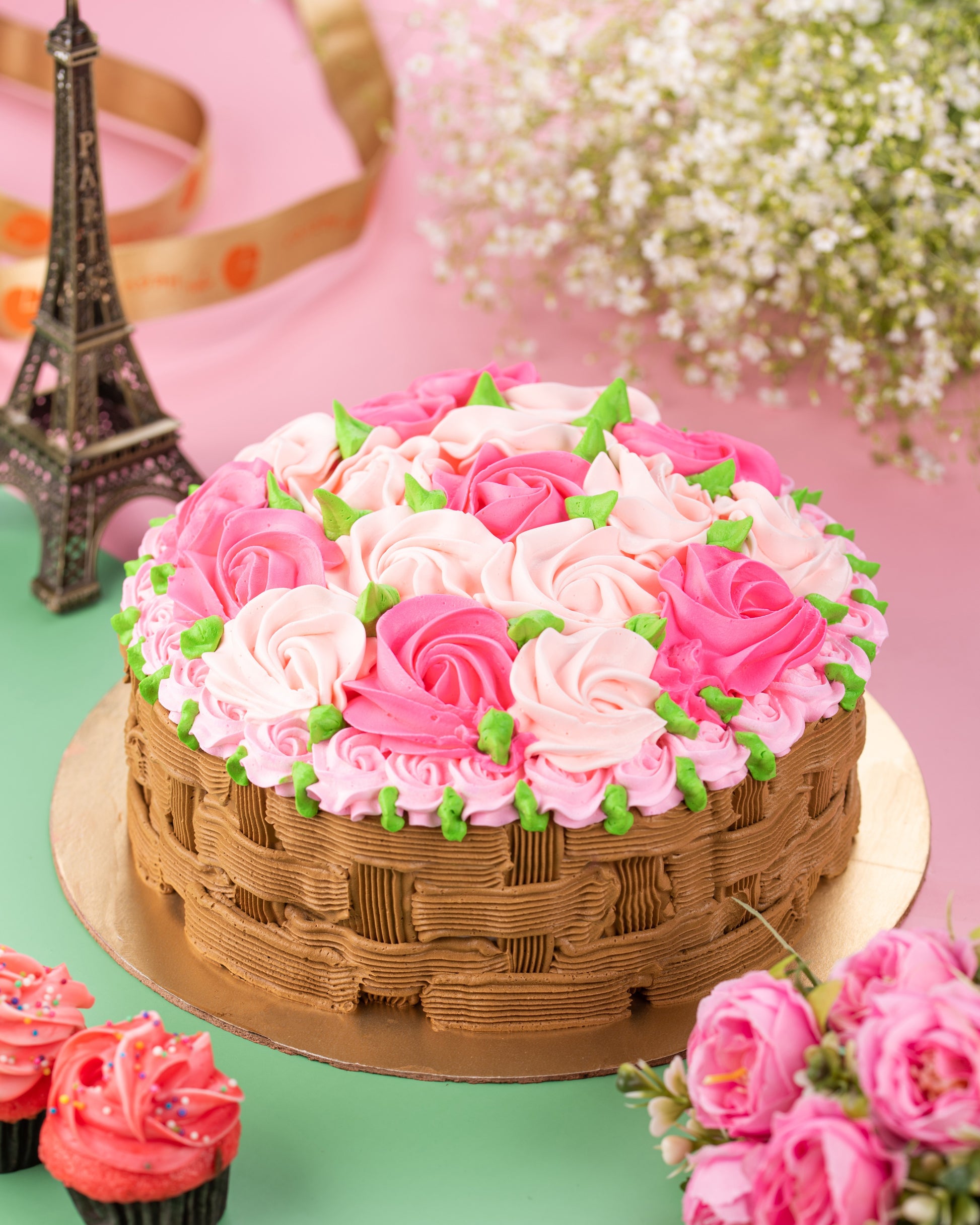 +44 7308 473219A beautifully piped buttercream cake with a basket-weave design and a bed of pink rose swirls with white truffle in vanilla sponge, perfect for birthdays, anniversaries, or Mother's Day.