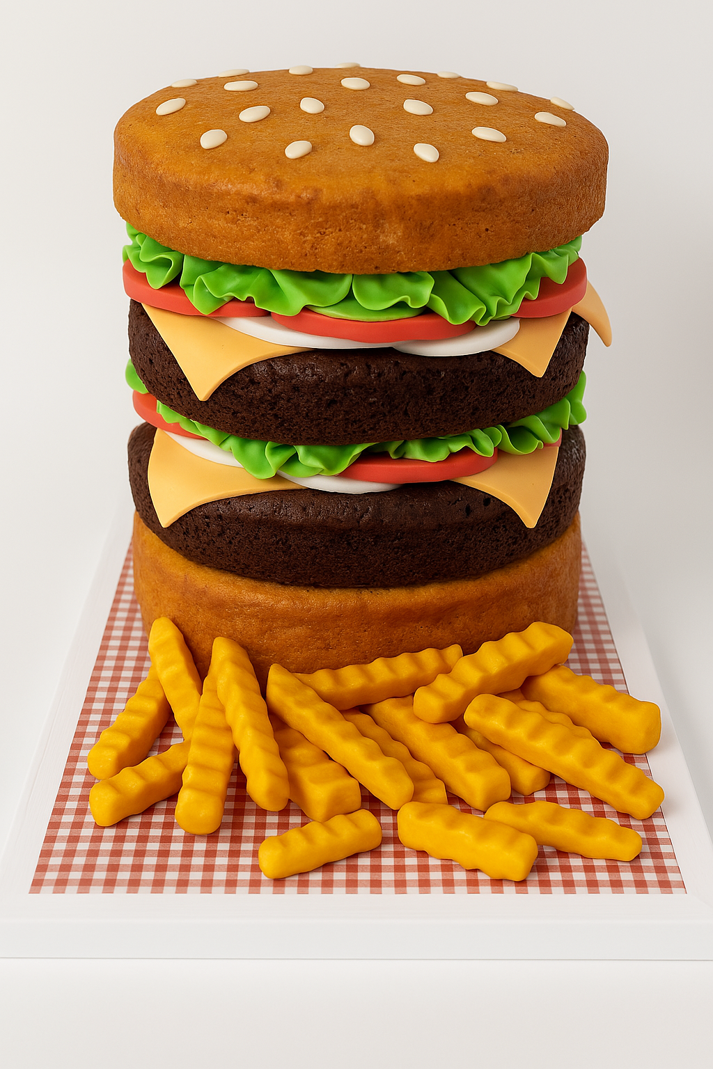 A towering burger cake served with a side of realistic crinkle-cut fries, the ultimate treat for fast food fans! Allergen Info: Contains allergens and may have traces of others due to cross-contamination. We do not accept allergy-specific orders. Not suitable for allergy sufferers. Please speak to staff for full details. Note: Larger cakes may have extra tiers. Design and colour may vary moderately from images.