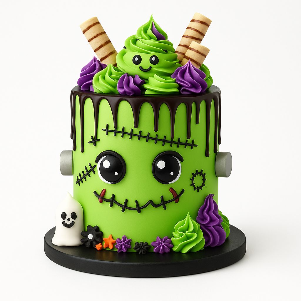 +44 7308 473219A spooky-cute green Frankenstein cake topped with swirls, wafers, and playful Halloween details.