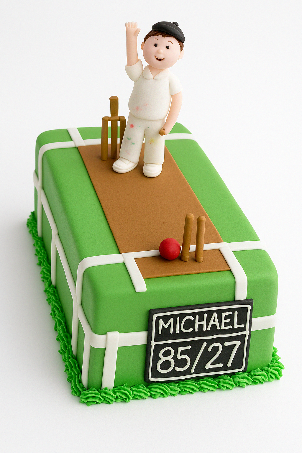 Hit it out of the park with this cricket-themed fondant cake! Perfect for your little sports star. Allergen Info: Contains allergens and may have traces of others due to cross-contamination. We do not accept allergy-specific orders. Not suitable for allergy sufferers. Please speak to staff for full details. Note: Larger cakes may have extra tiers. Design and colour may vary moderately from images.