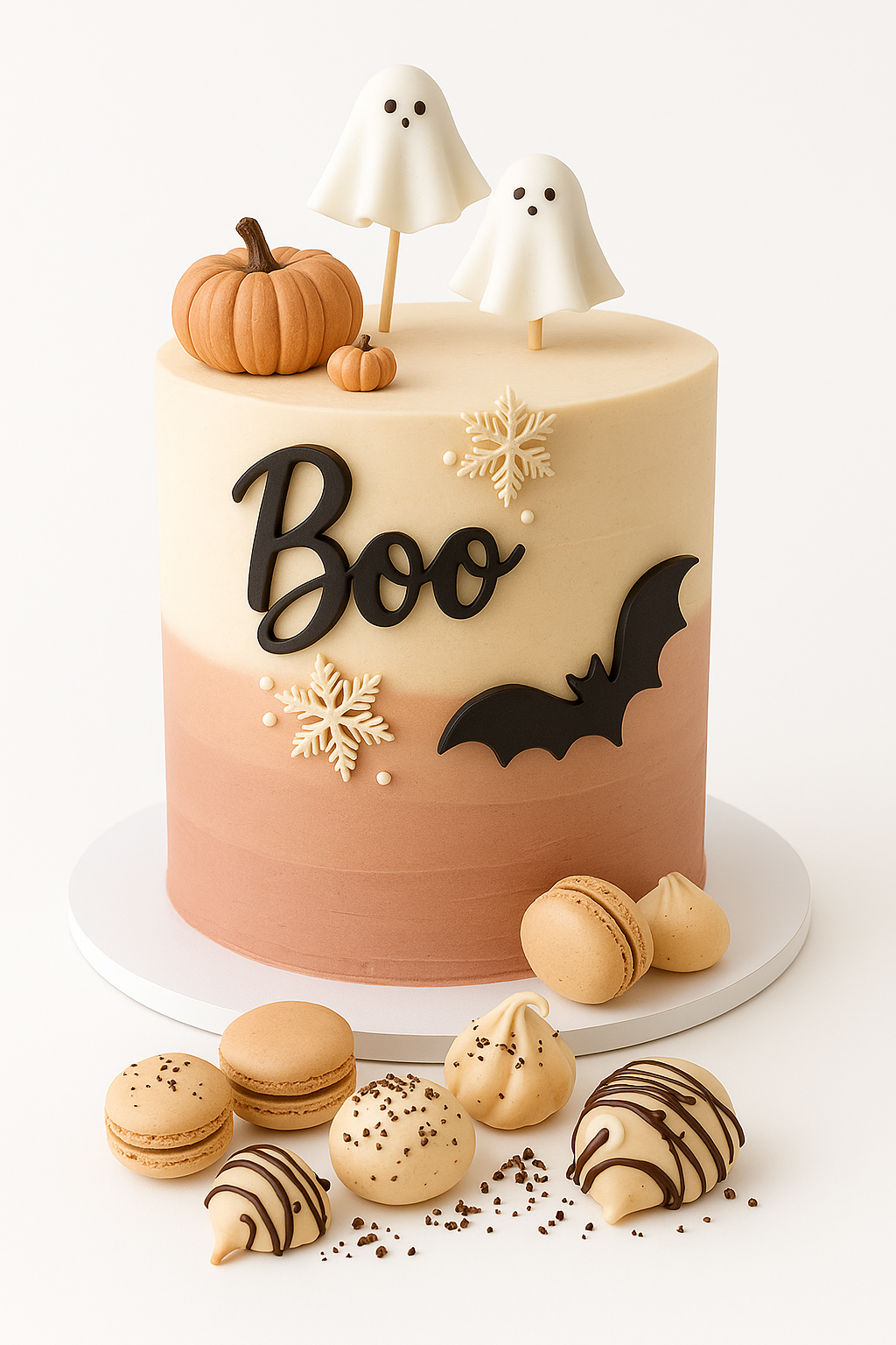 A stylish ombré buttercream cake, perfect for Halloween parties with a chic twist. Allergen Info: Contains allergens and may have traces of others due to cross-contamination. We do not accept allergy-specific orders. Not suitable for allergy sufferers. Please speak to staff for full details. Note: Larger cakes may have extra tiers. Design and colour may vary moderately from images.
