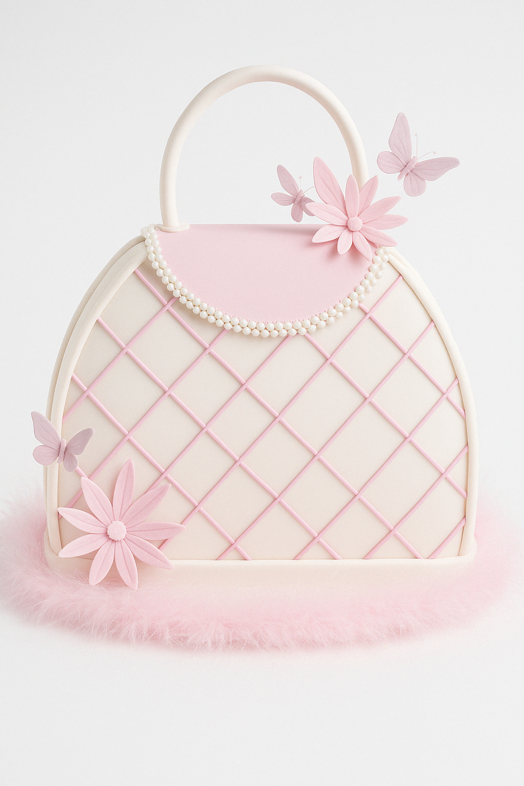 A pastel pink handbag cake adorned with butterflies, flowers, and pearl details for a soft feminine charm.