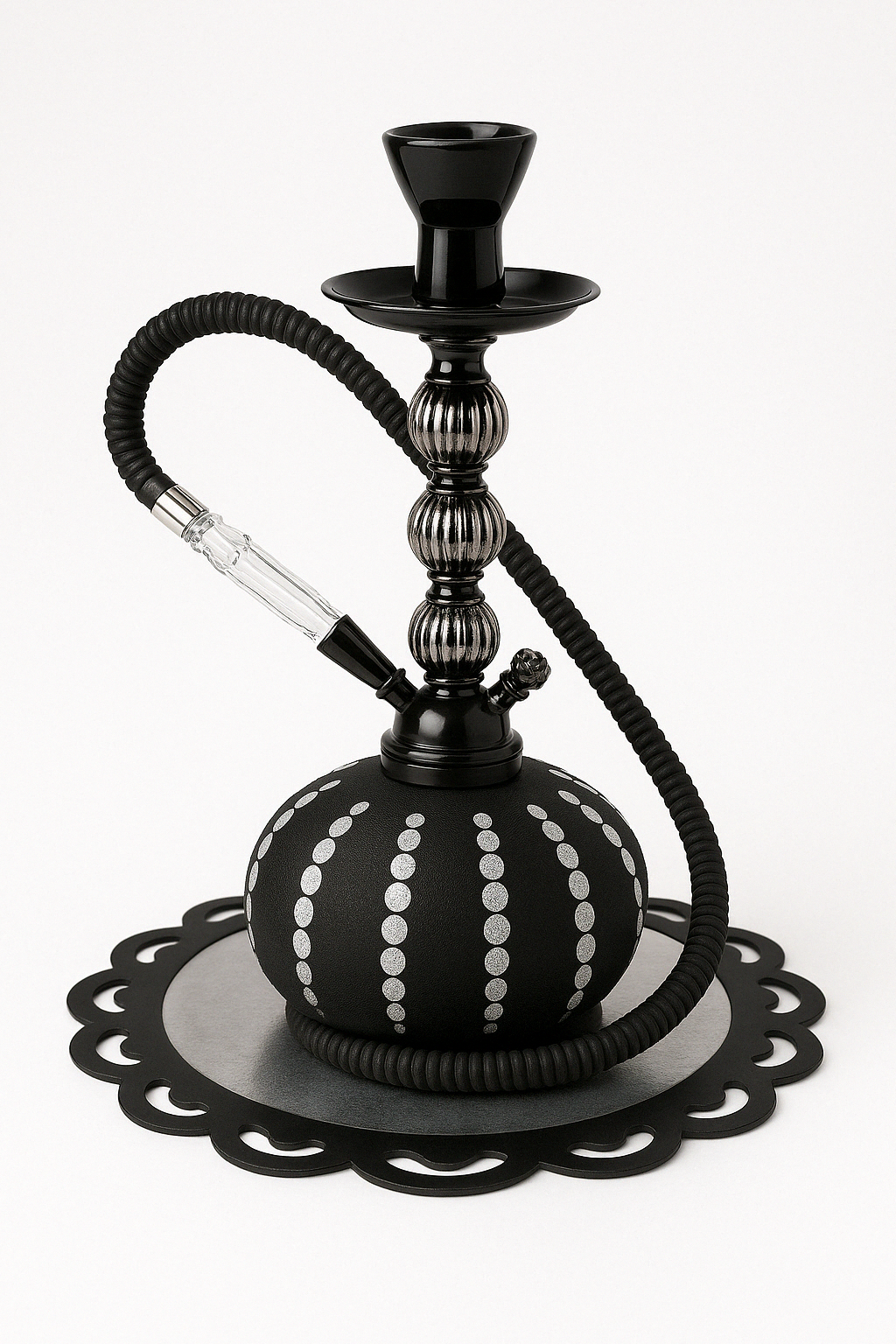 +44 7308 473219A stunning all-black fondant cake sculpted to resemble a luxurious hookah, for an ultra-glam look. Perfect for statement celebrations.