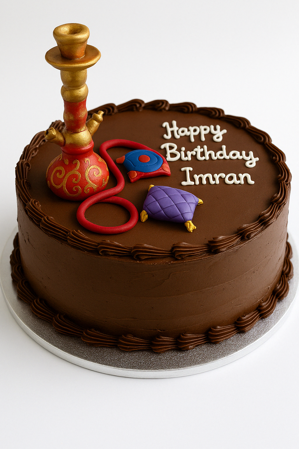 Rich chocolate buttercream cake topped with a fondant hookah. A fun and flavourful birthday cake for hookah lovers. Allergen Info: Contains allergens and may have traces of others due to cross-contamination. We do not accept allergy-specific orders. Not suitable for allergy sufferers. Please speak to staff for full details. Note: Larger cakes may have extra tiers. Design and colour may vary moderately from images.
