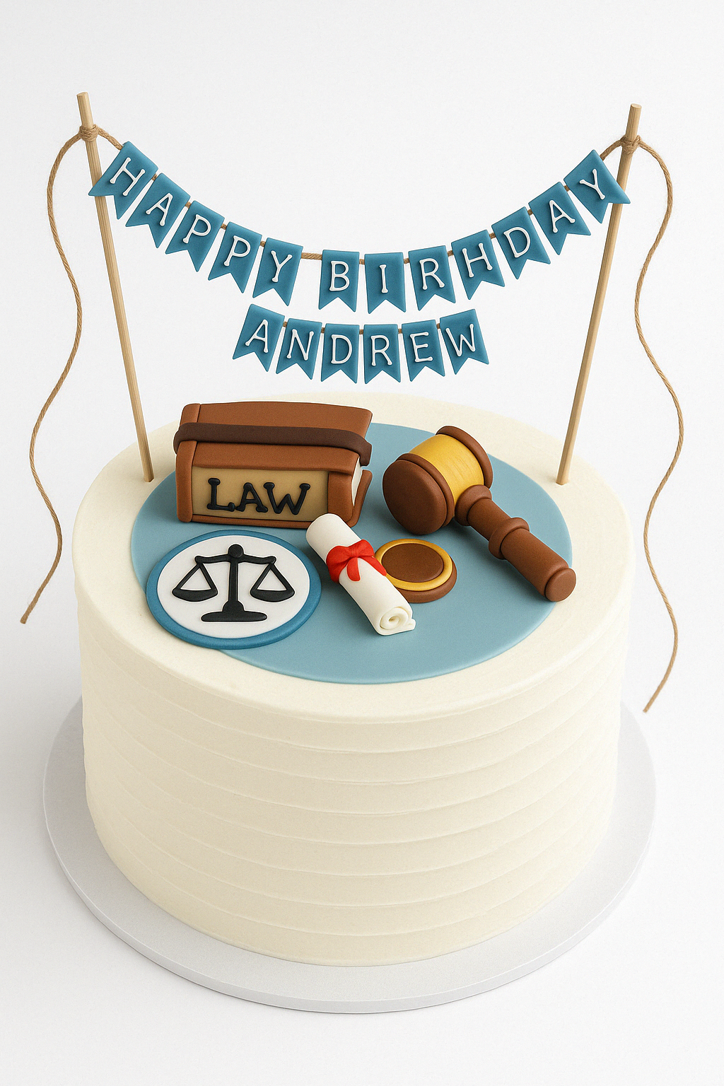 +44 7308 473219A smooth buttercream cake topped with fondant legal icons, perfect for lawyers, law students or legal professionals celebrating their big day.