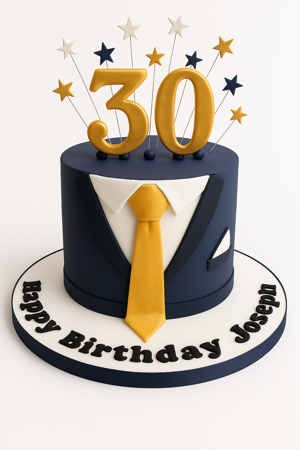 A navy blue suit cake with golden tie and “30” topper for milestone birthdays.