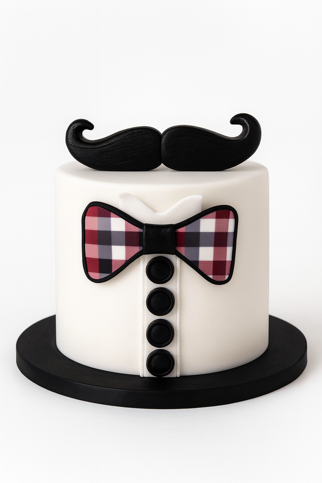 A stylish fondant cake decorated with a bold black mustache, plaid bow tie, and button details for a classy celebration.