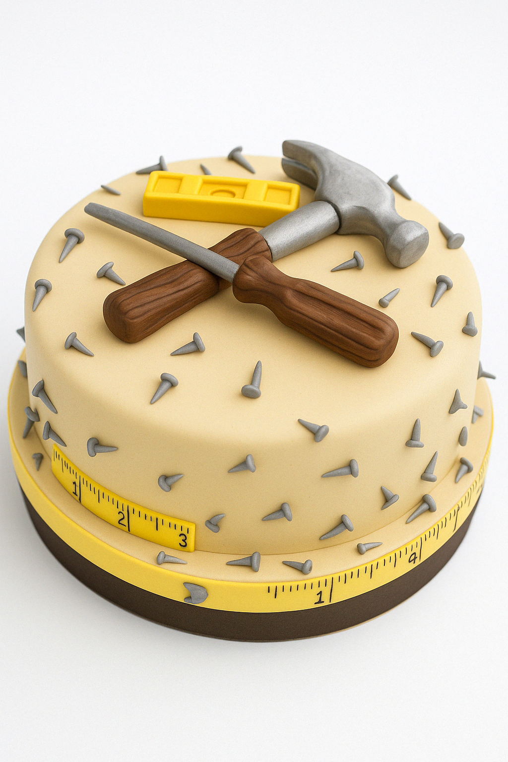 A fun and creative fondant cake decorated with edible nails, tools, and a tape measure, perfect for birthdays of builders or handymen. Allergen Info: Contains allergens and may have traces of others due to cross-contamination. We do not accept allergy-specific orders. Not suitable for allergy sufferers. Please speak to staff for full details. Note: Larger cakes may have extra tiers. Design and colour may vary moderately from images.