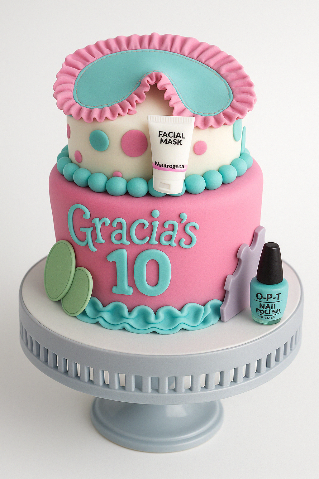 +44 7308 473219A pastel fondant cake celebrating a spa-themed birthday! This cake is perfect for a pamper party or a glam-loving birthday girl.