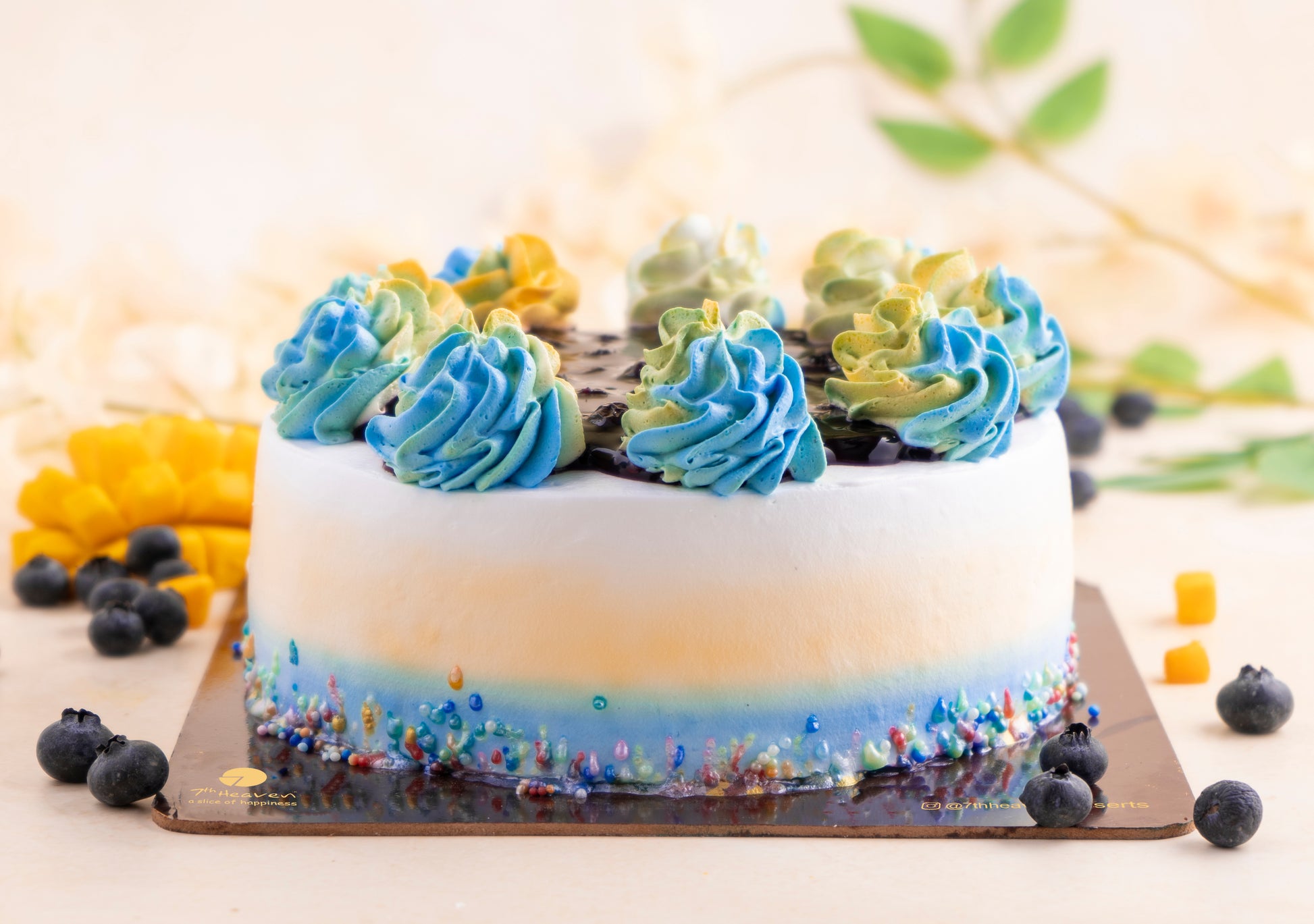+44 7308 473219A vibrant tropical cake featuring layers of mango and blueberry flavours, topped with whipped swirls, blueberry compote, and rainbow sprinkles.