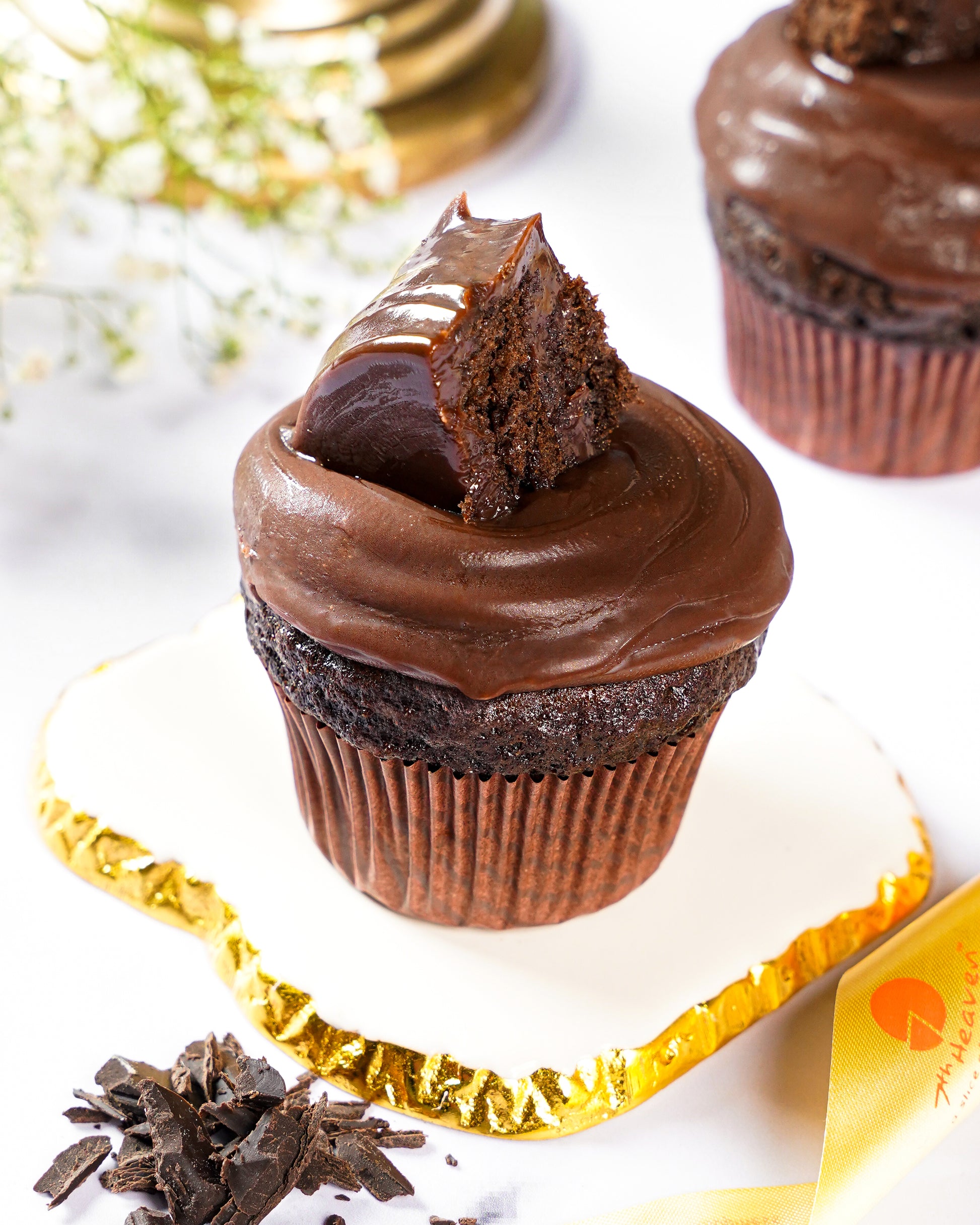 A moist chocolate sponge cupcake topped with rich, flavourful frosting, perfect for individual celebrations and sweet cravings.