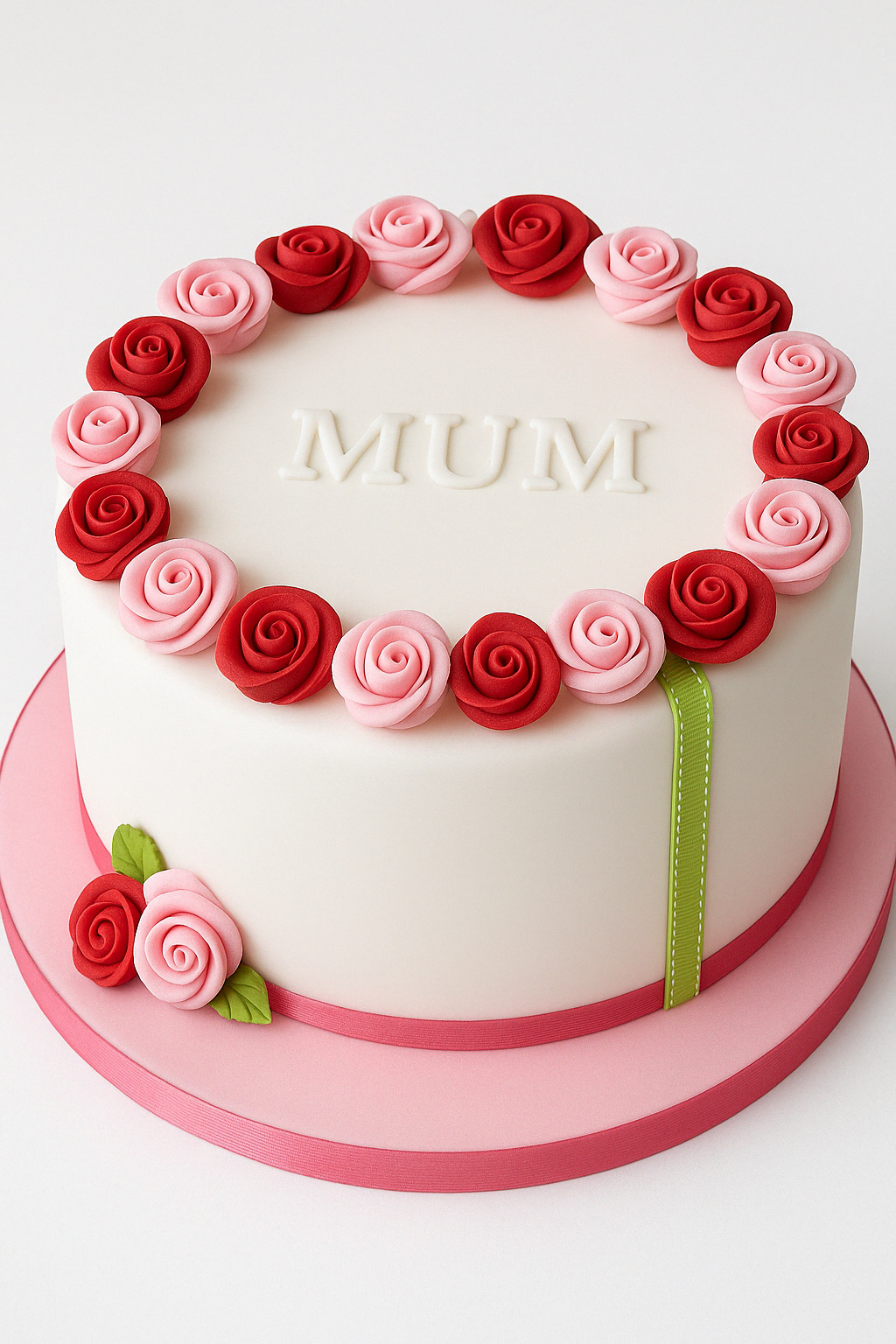 A stunning fondant cake adorned with red and pink roses forming a beautiful floral ring, perfect for Mother’s Day and birthdays. Allergen Info: Contains allergens and may have traces of others due to cross-contamination. We do not accept allergy-specific orders. Not suitable for allergy sufferers. Please speak to staff for full details. Note: Larger cakes may have extra tiers. Design and colour may vary moderately from images.