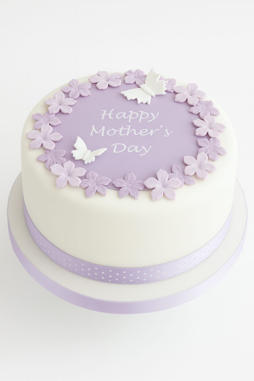 A delicate lavender fondant cake with butterflies and flowers, perfect for celebrating mom.