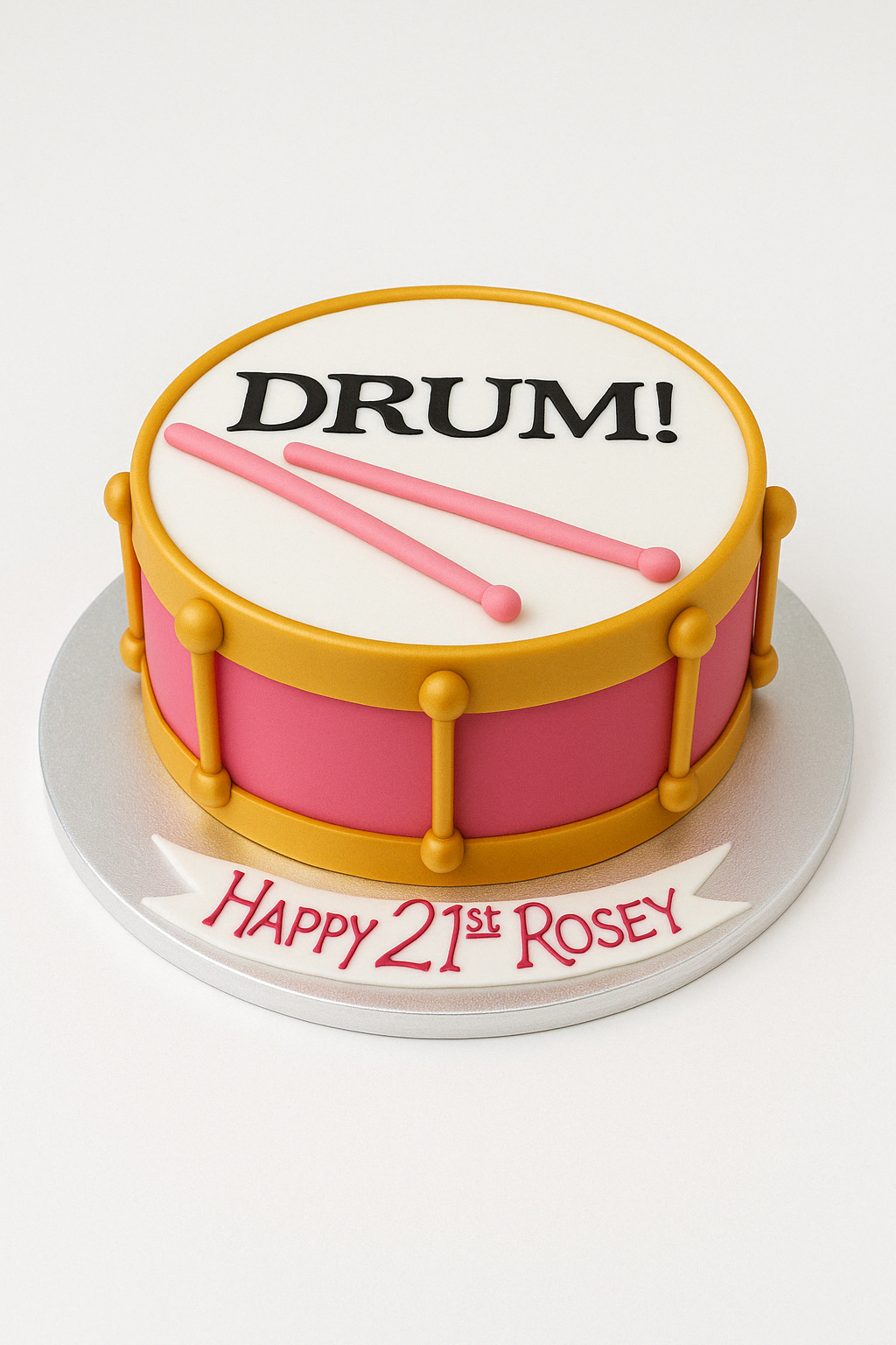 A fun fondant cake shaped like a drum with pink sticks, perfect for drummers and rhythm lovers.