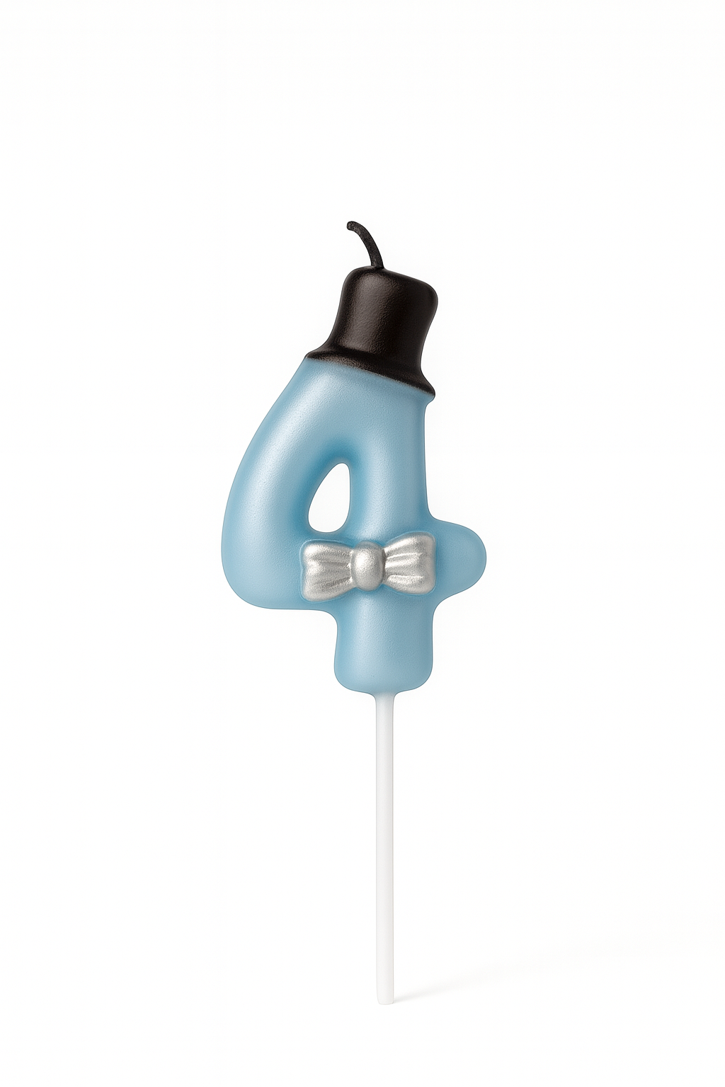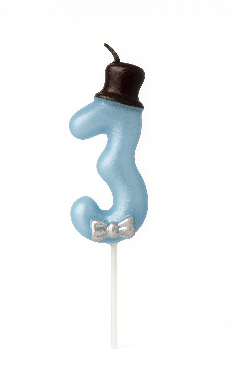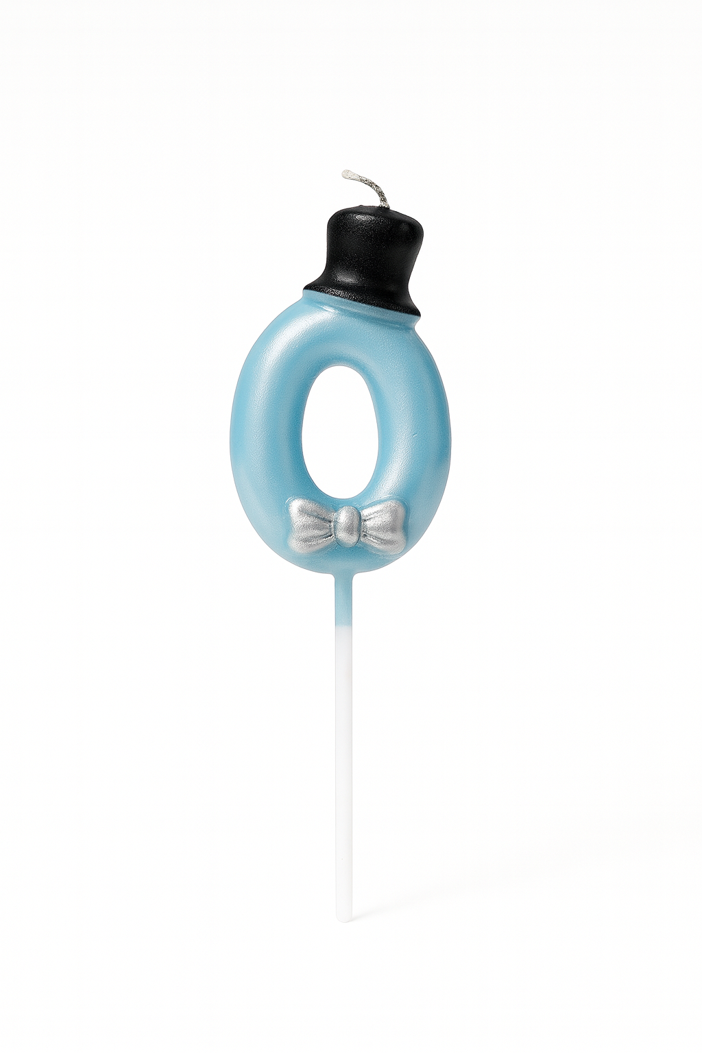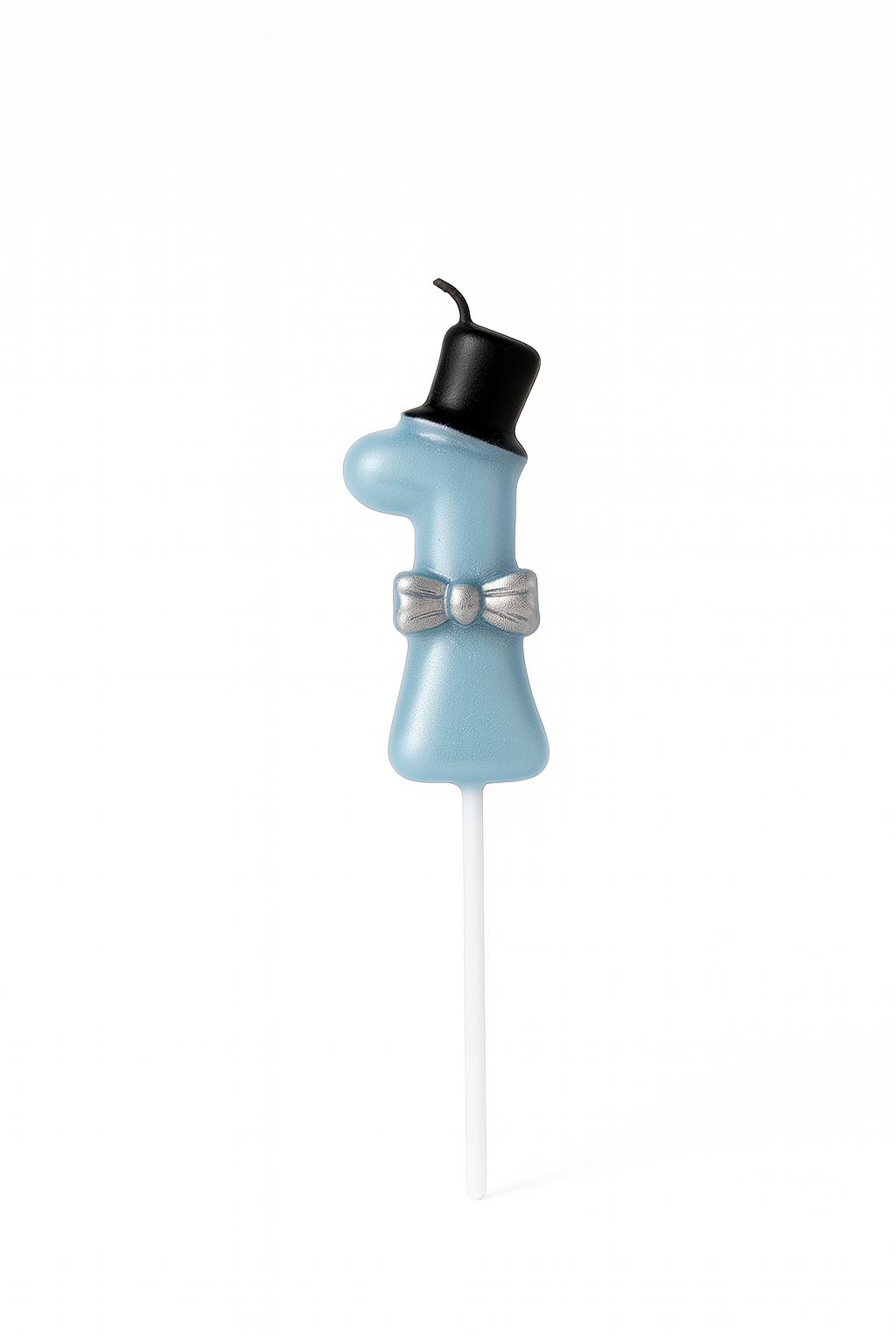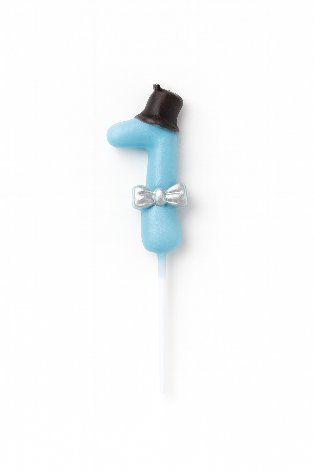 Cute blue number candle with a black hat and silver bow, perfect for fun birthday celebrations.
