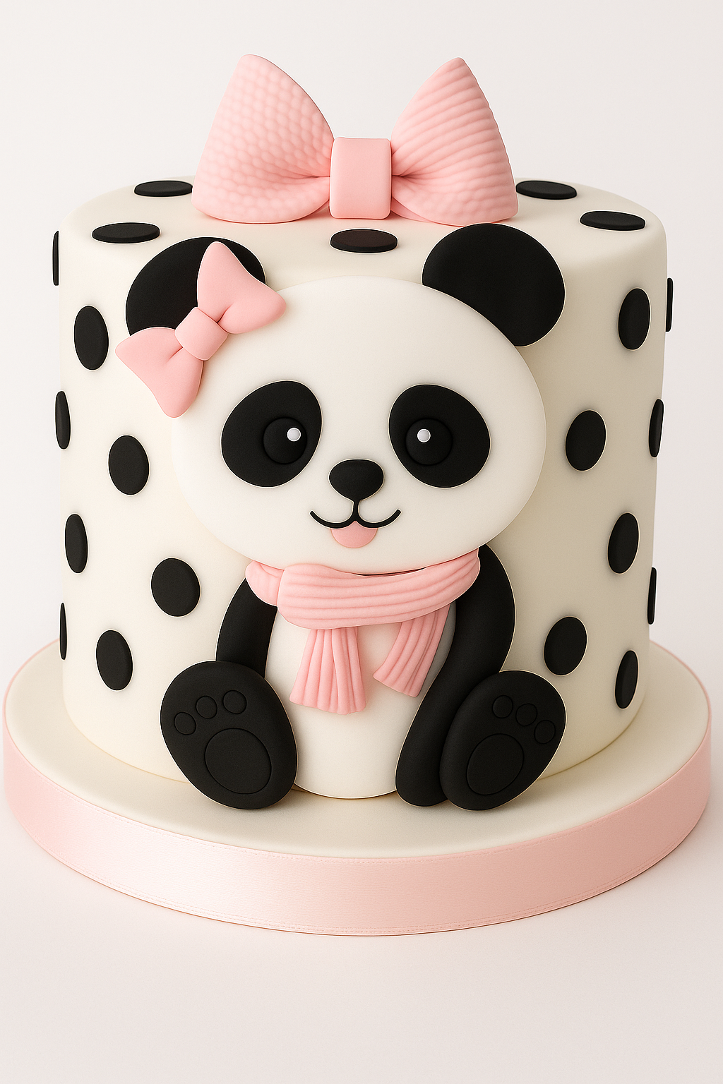 +44 7308 473219This fondant cake features a cute panda with pink bows—perfect for a stylish and adorable birthday celebration.