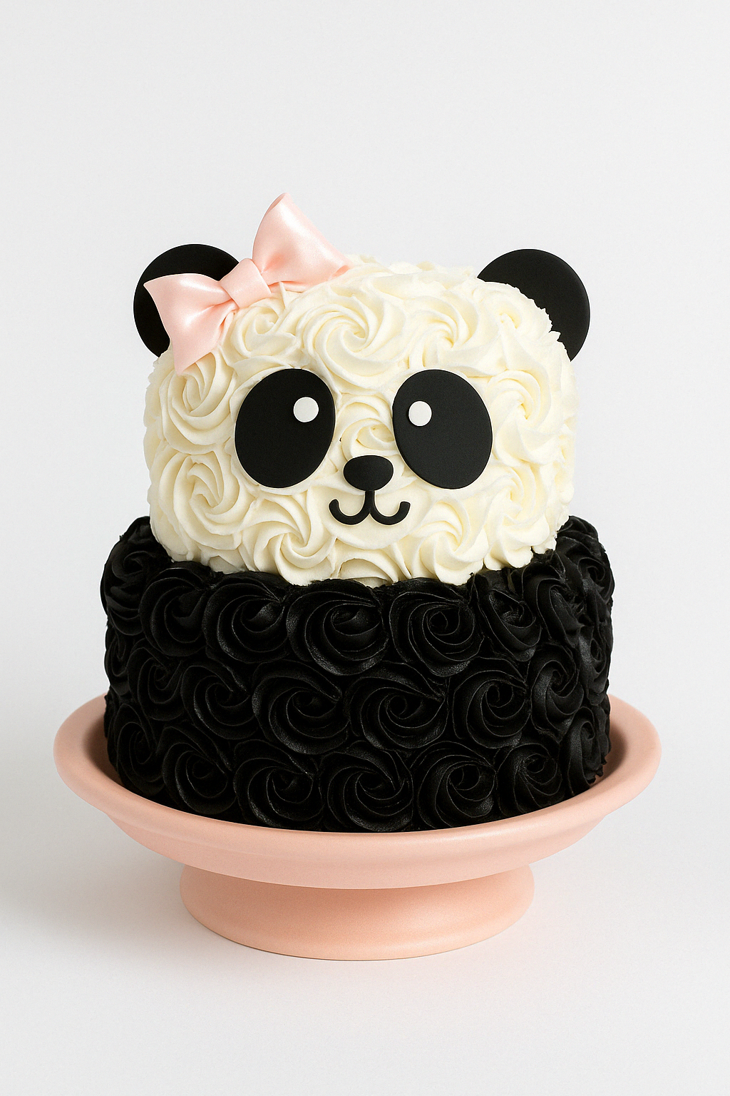 This adorable panda-themed buttercream cake is decorated with elegant floral swirls and topped with fondant features and a cute pink bow, perfect for a girly celebration. Allergen Info: Contains allergens and may have traces of others due to cross-contamination. We do not accept allergy-specific orders. Not suitable for allergy sufferers. Please speak to staff for full details. Note: Design and colour may vary moderately from images.