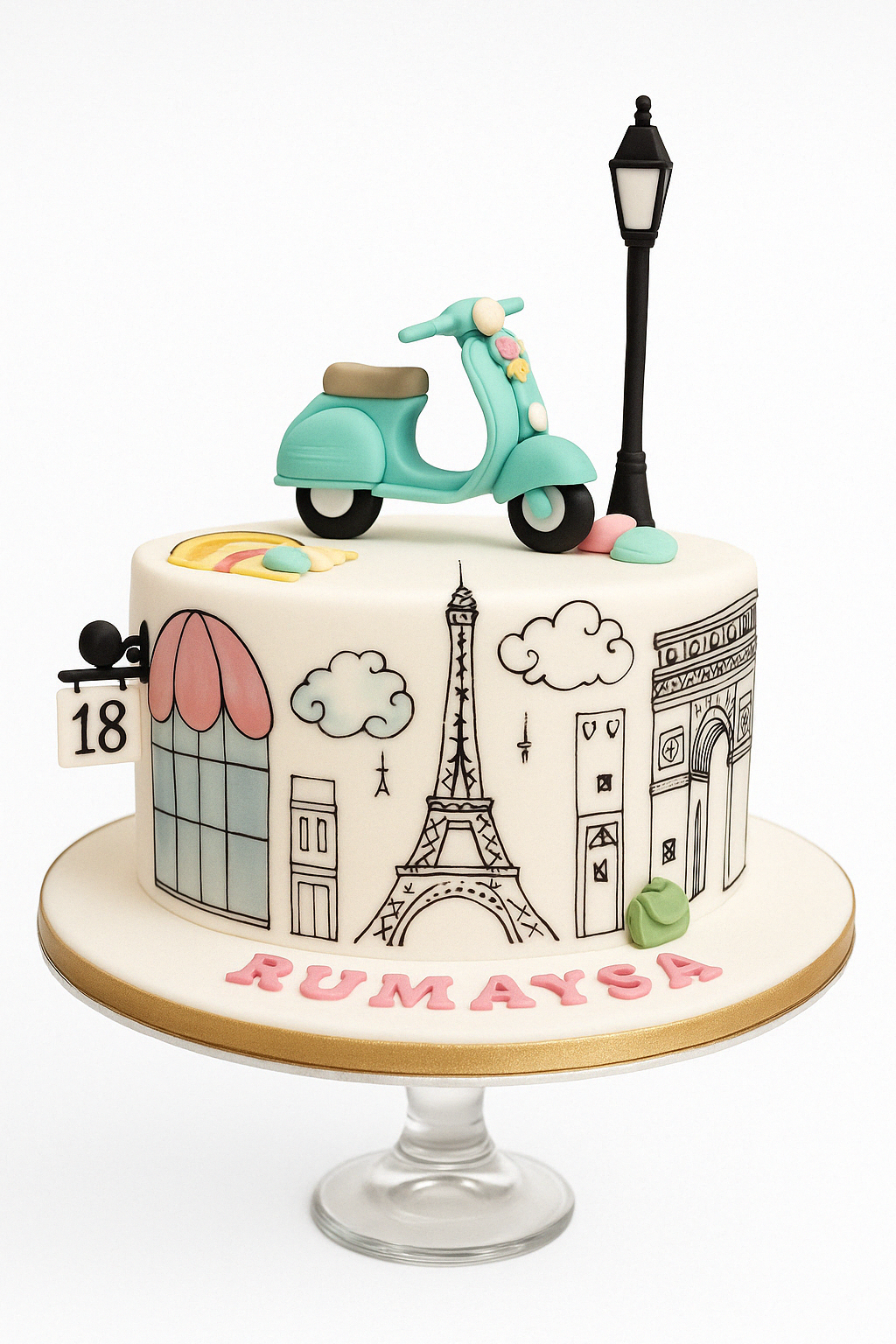 A stylish cake featuring a pastel scooter, Eiffel Tower sketches, and Paris landmarks for a chic celebration.