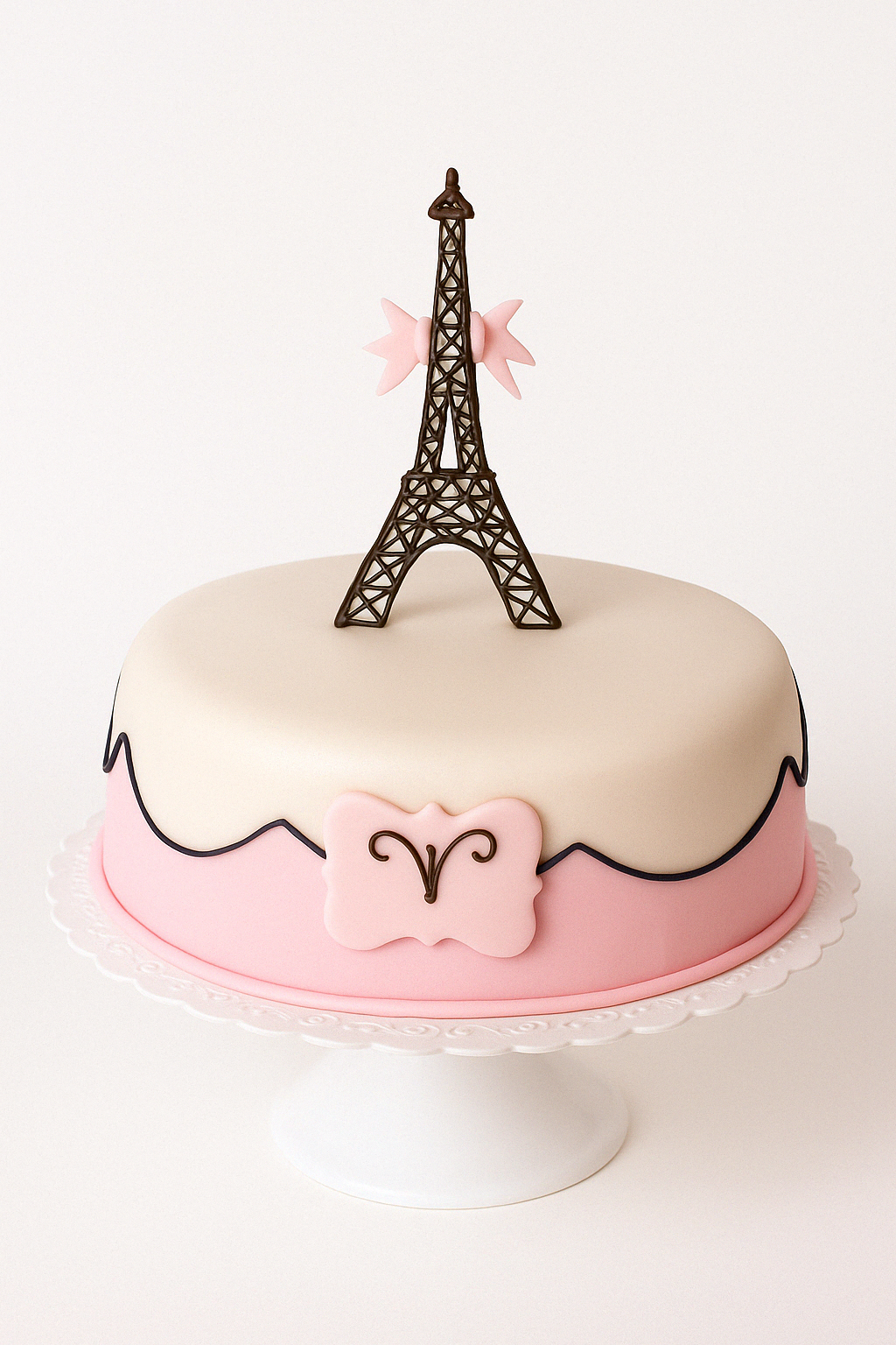 A sweet and simple fondant cake with a Parisian flourish, perfect for a chic celebration. Allergen Info: Contains allergens and may have traces of others due to cross-contamination. We do not accept allergy-specific orders. Not suitable for allergy sufferers. Please speak to staff for full details. Note: Larger cakes may have extra tiers. Design and colour may vary moderately from images.