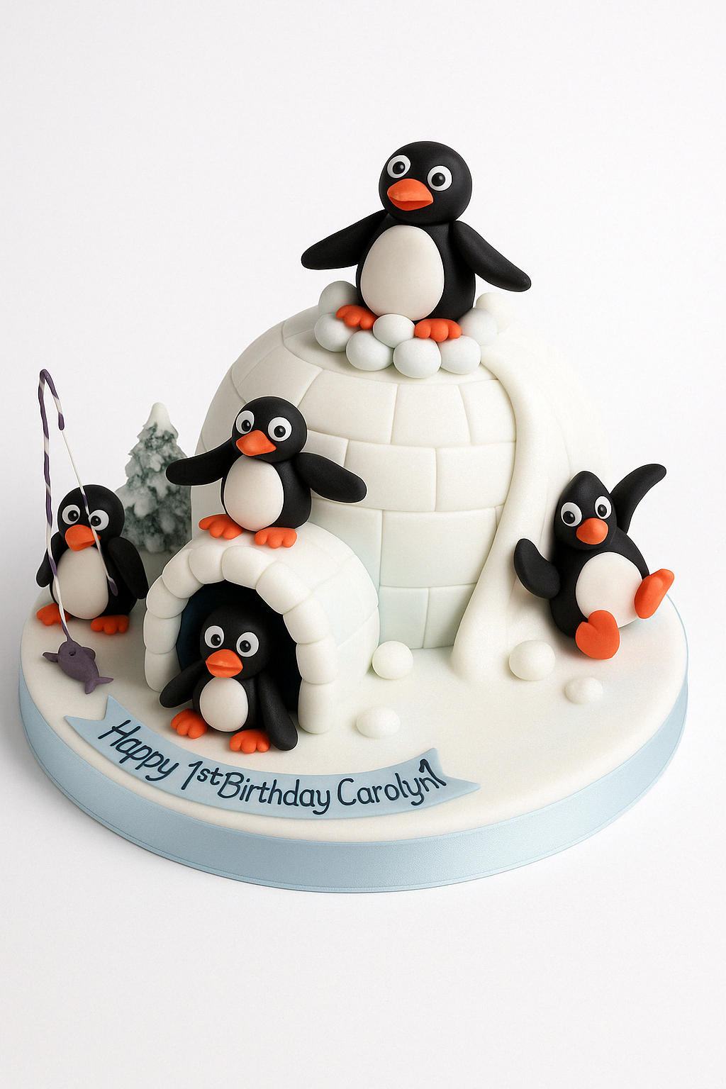 +44 7308 473219This fondant cake features an adorable Arctic scene with penguins, igloos, and snowballs. Perfect for a winter-themed 1st birthday celebration.
