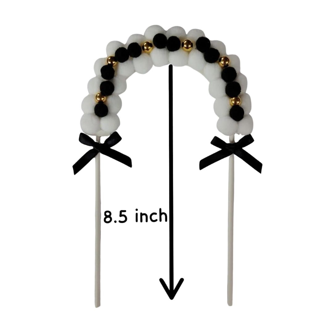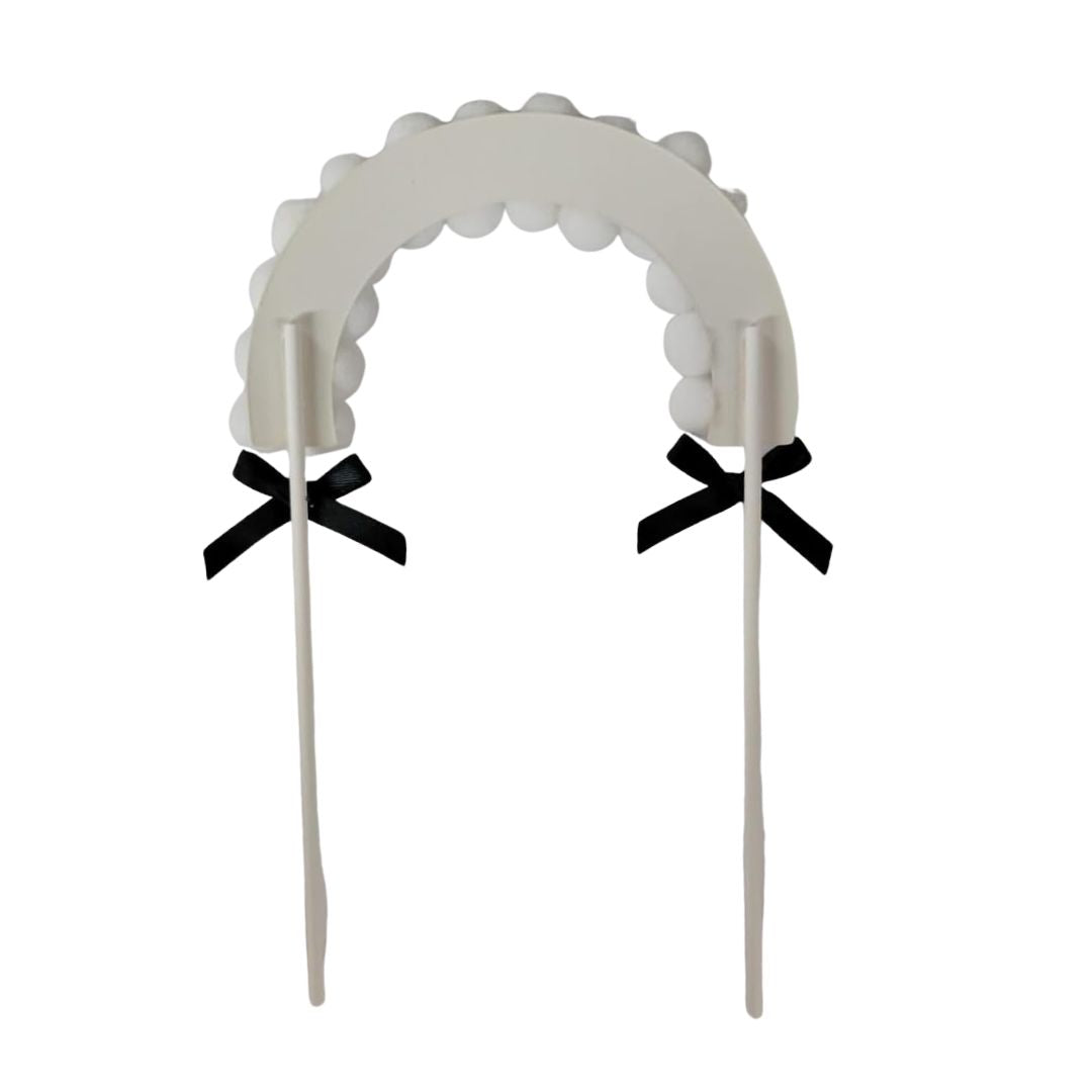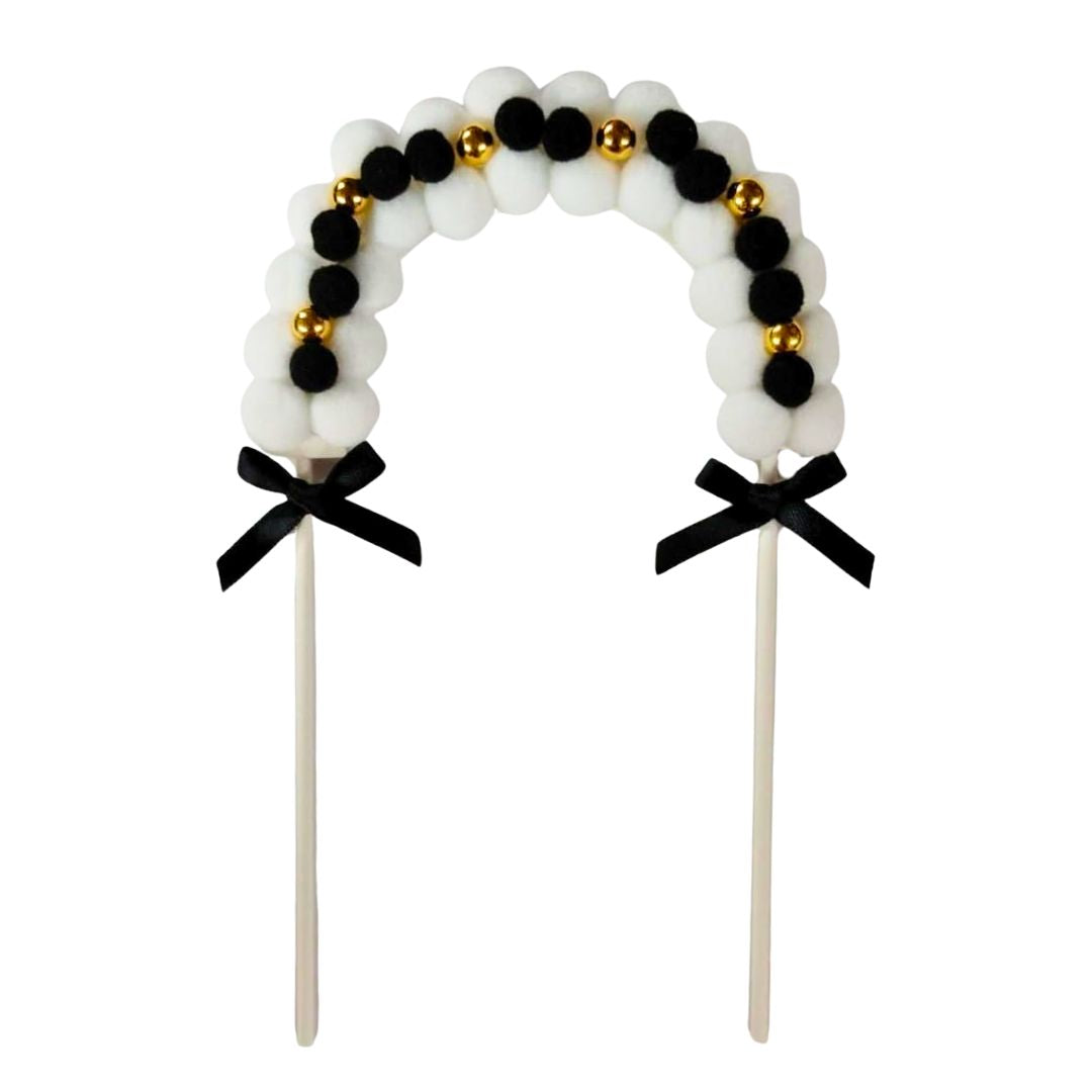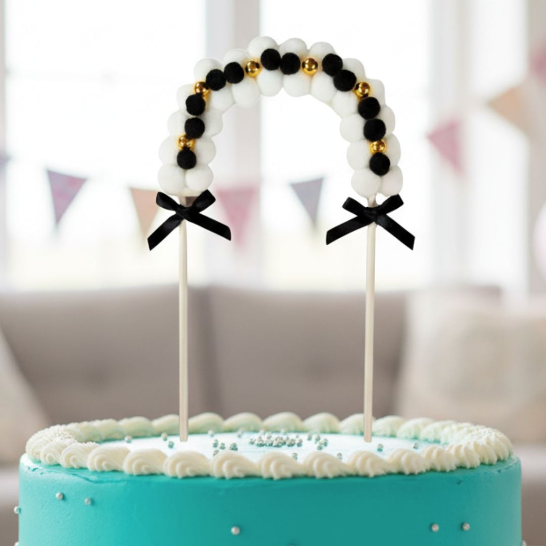 Cute pastel topper with pom-poms, golden beads, and ribbon bows.
