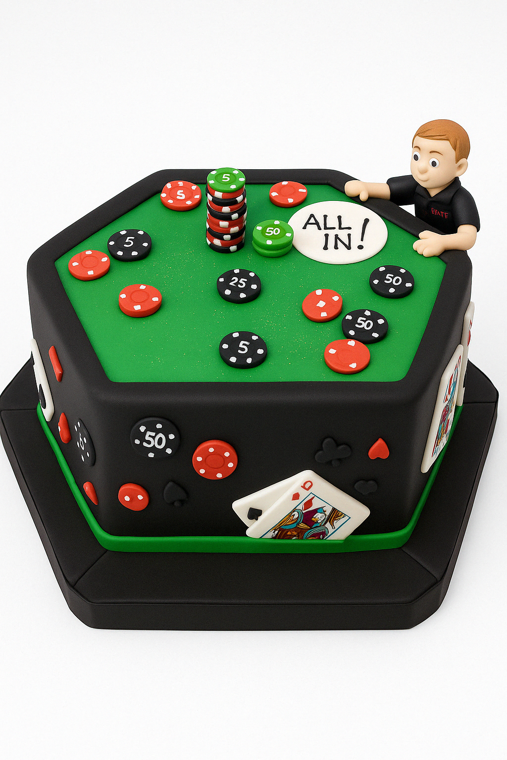 +44 7308 473219A playful fondant cake designed like a poker table, complete with edible chips, cards, and a dealer, perfect for a poker enthusiast's birthday.
