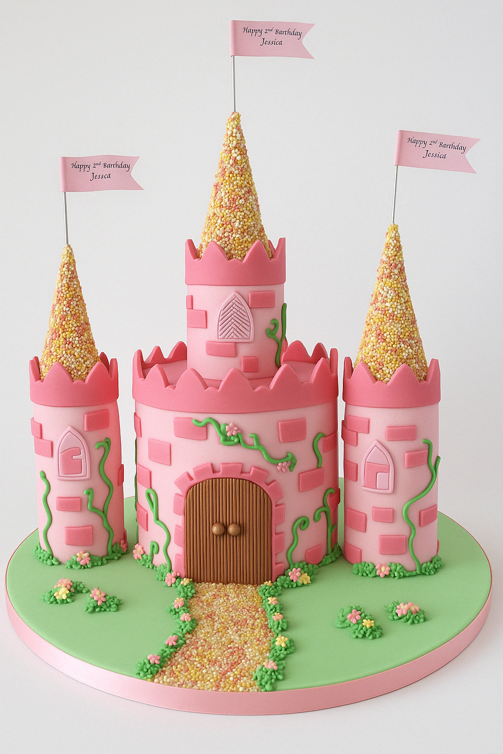 A fairytale castle cake with pink towers, sugar flags, and blooming fondant vines.