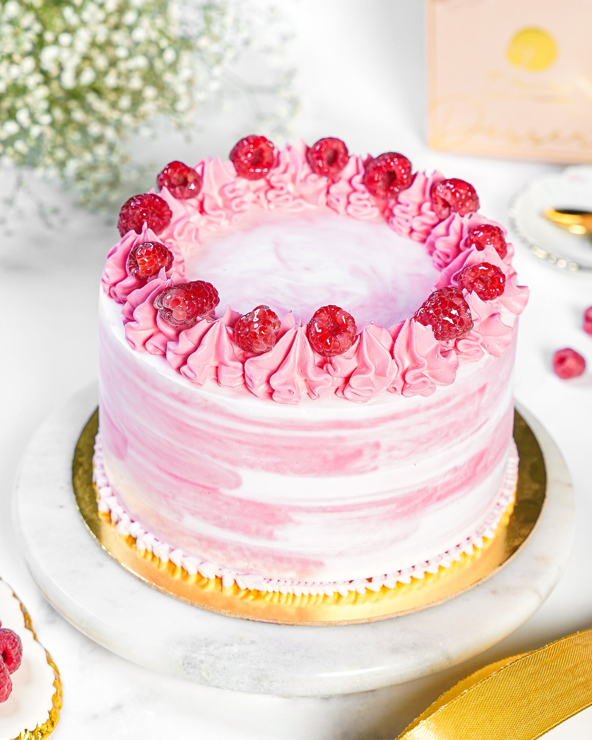 +44 7308 473219A vibrant pink marbled cake with swirls of raspberry-infused cream, topped with luscious raspberries and piped rosettes.