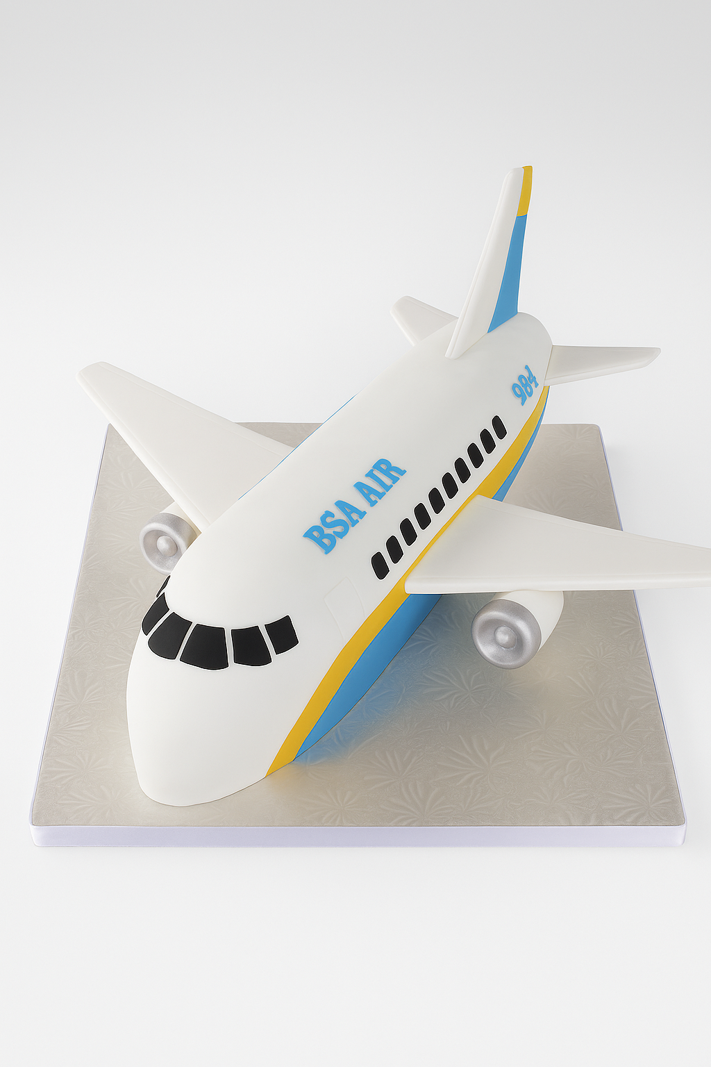 A realistic airplane-shaped fondant cake is perfect for aviation enthusiasts. Allergen Info: Contains allergens and may have traces of others due to cross-contamination. We do not accept allergy-specific orders. Not suitable for allergy sufferers. Please speak to staff for full details. Note: Larger cakes may have extra tiers. Design and colour may vary moderately from images.