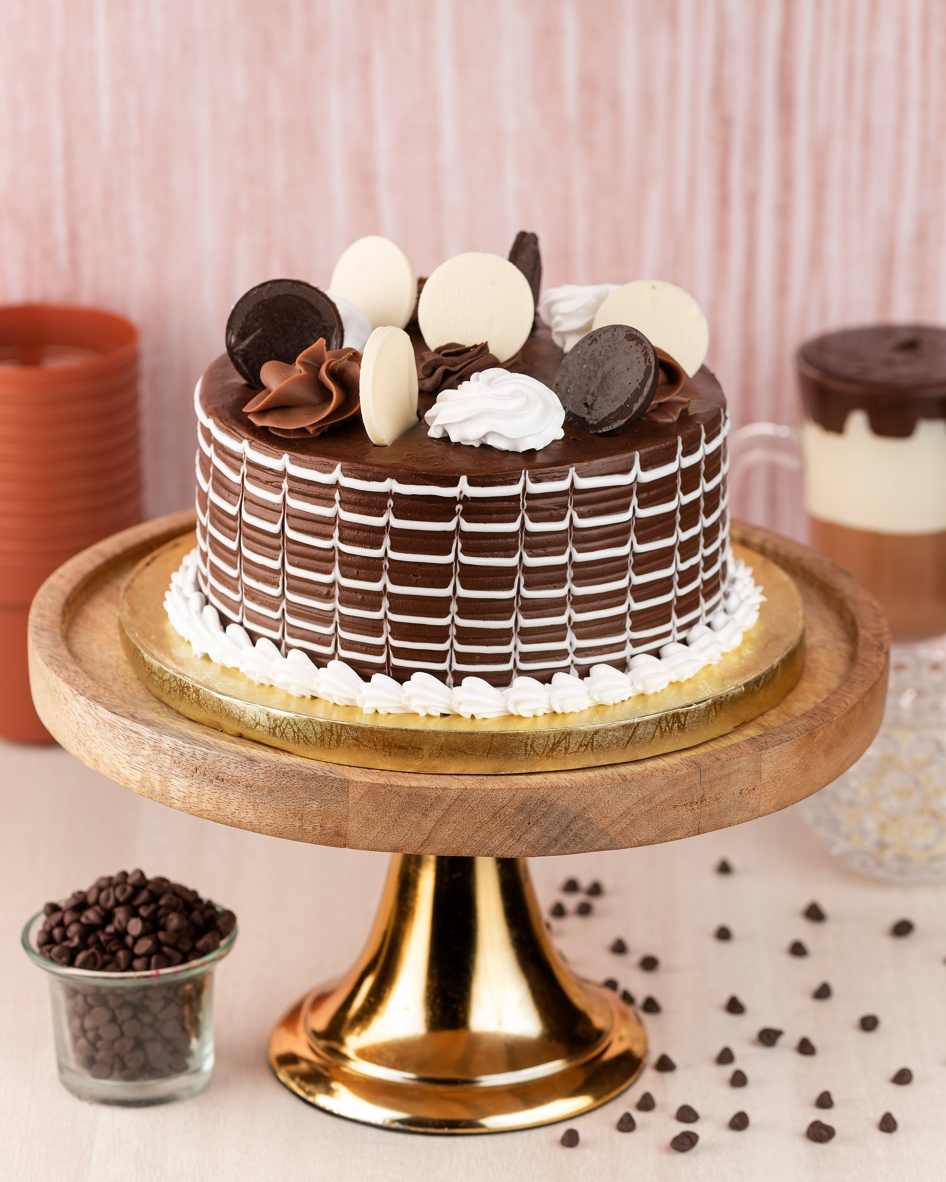 +44 7308 473219A decadent chocolate cake topped with layers of dark, milk, and white chocolate elements, finished with piped swirls and a lattice ganache design.