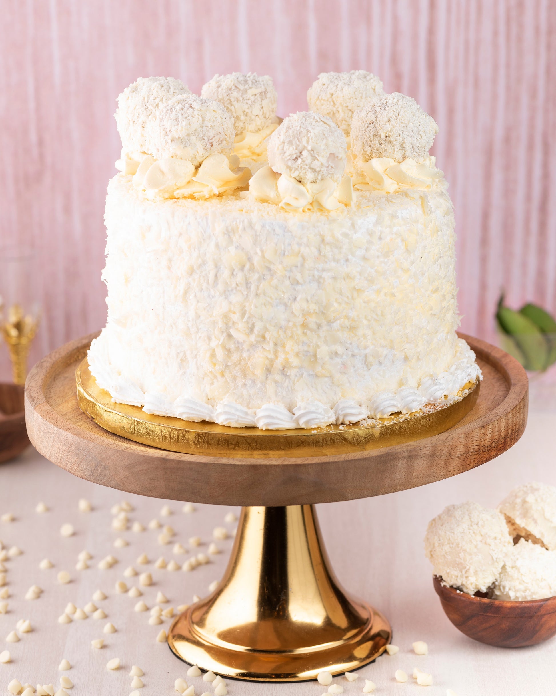 +44 7308 473219A luxurious white chocolate cake coated in shredded coconut, topped with creamy swirls and coconut truffles.